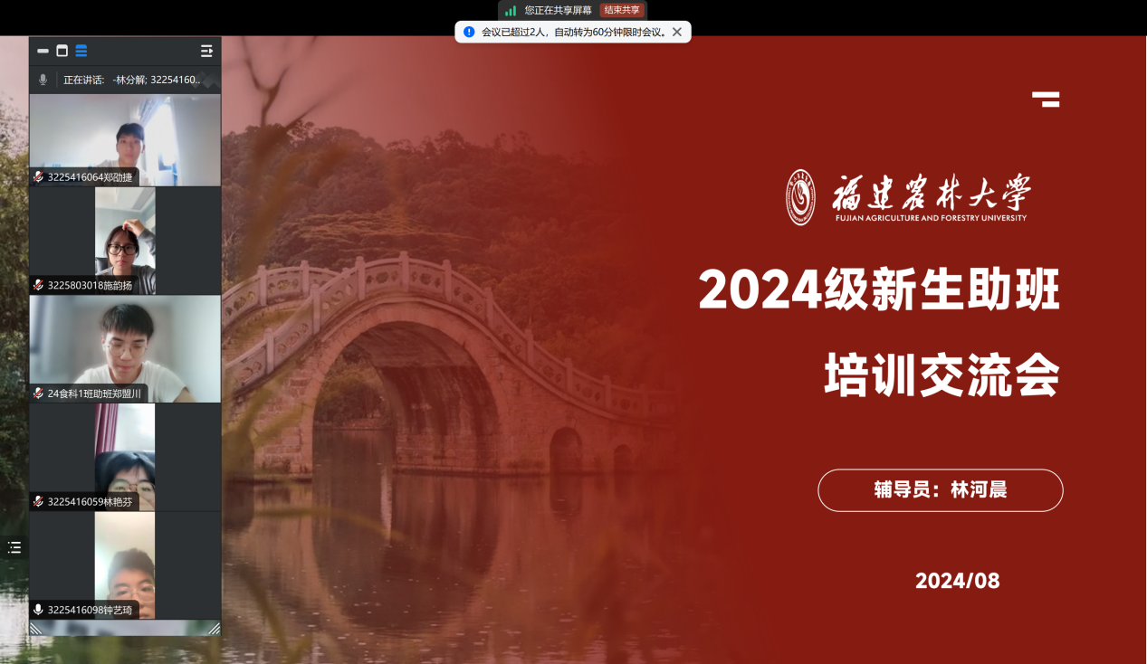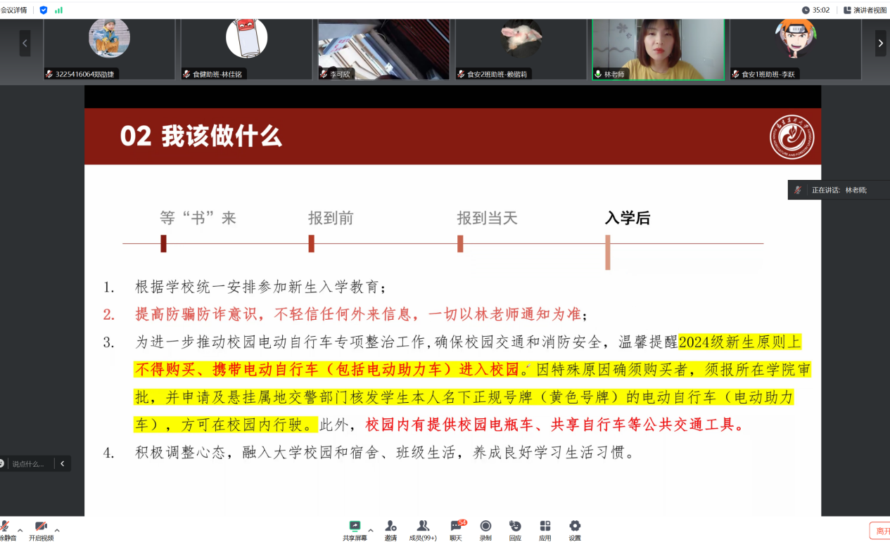 此前,学院开展2024级新生“云端面对面”交流活动、助班培训等,在新生入学前就通过线上的交流沟通,为新生答疑解惑,帮助新生群体尽快做好入学准备、完成角色转换,切实为新生贴心服务、关心守护、爱心领航。学院硕士新生辅导员陈文滔、本科新生辅导员林河晨参加交流会。