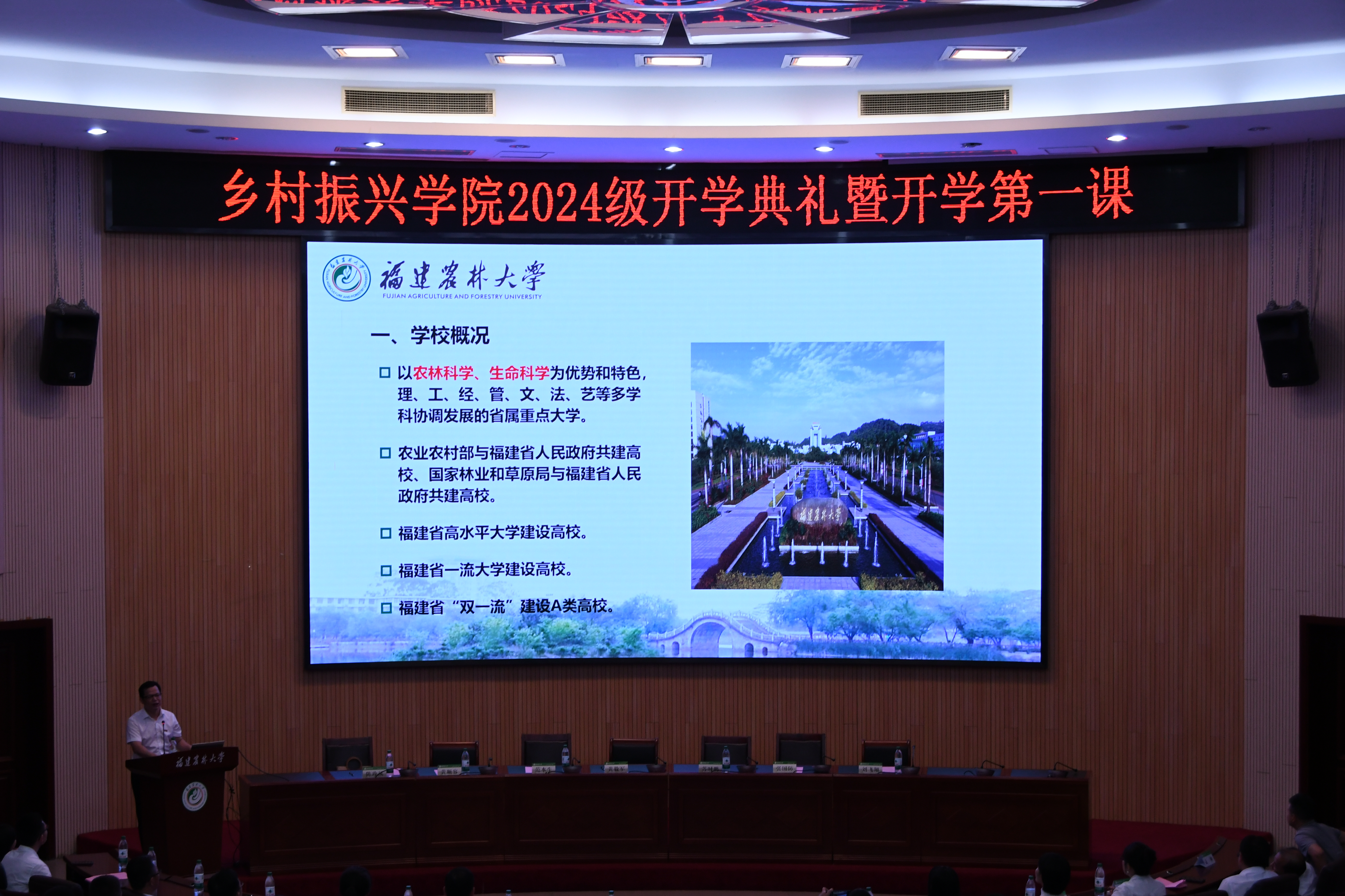 9月8日下午,乡村振兴学院在博学报告厅举行2024级新生开学典礼暨开学第一课。学院党委书记黄毅军,执行院长苏时鹏,校发展规划处处长、学院教授委员会主任范水生,学院党委副书记陈玲凤,副院长张国防、黄顺容,学院工会主席、农村区域发展系主任刘飞翔,特邀优秀校友代表及学院全体教职工、在校生代表、2024级全体新生等230余人参加。开学典礼由陈玲凤主持。