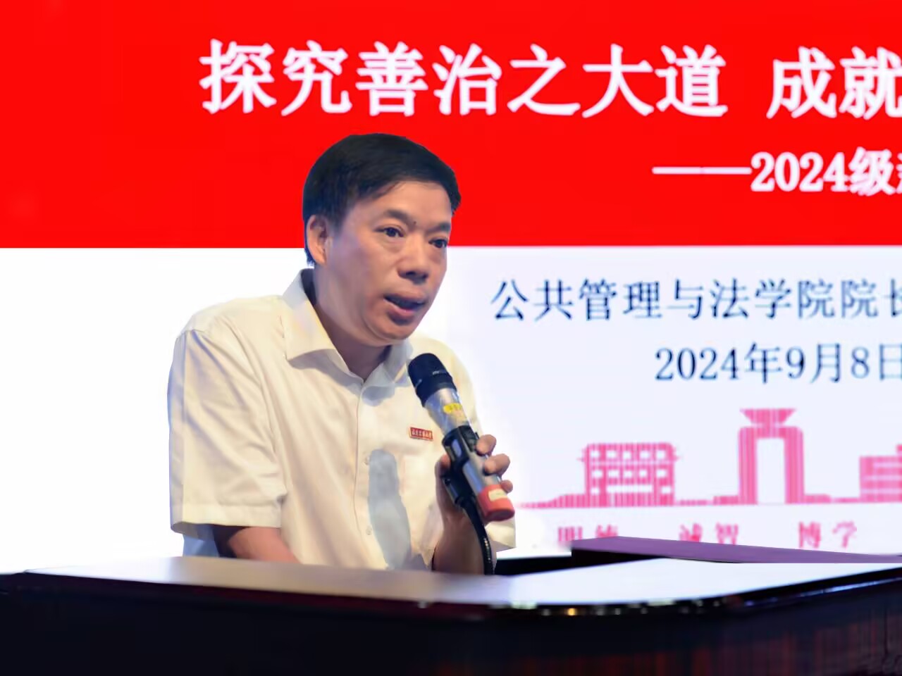 开学典礼在壮丽恢弘的国歌声中拉开帷幕。郭为桂代表学院致辞,向2024级新生的到来表示热烈的欢迎,并以“探究善治之大道,成就挺立之大我”为题,对新生提出深厚的期望,从专业化角度,希望同学们能够系统地掌握专业知识,沉浸涵养专业素质,累进提高专业能力,厚植学科专业基础,活跃学习研讨氛围和强化实践锻炼;从人格化的角度,希望同学们做一个有品位有大我,善于从大处着眼小处着手,有独立思考和实践能力,能经受住外在和内在冲击的坚毅而挺立的人,把专业使命和职业使命结合起来,在探索善治之大道中养成挺立之大我。