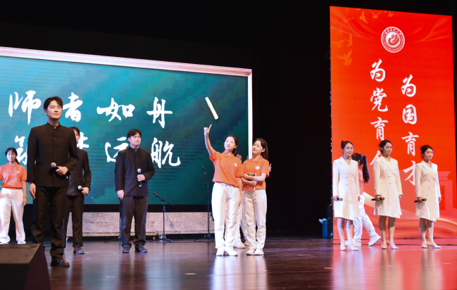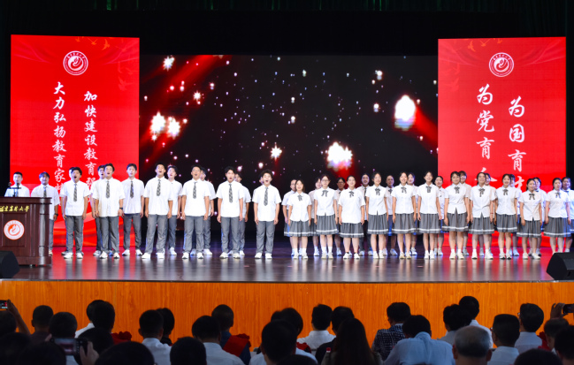 会议中还穿插了学生表演的合唱曲目《夜空中最亮的星》及诗朗诵《师者如舟,筑梦远航》,向辛勤付出的教师表达了节日的美好祝愿。大会在全体人员合唱《歌唱祖国》的悠扬旋律中落下帷幕。