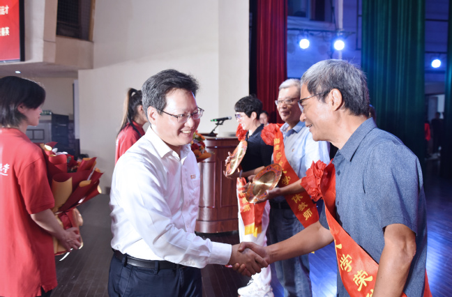 会议举行了新教师入职仪式,王建南、兰思仁分别为新教师代表佩戴校徽,新教师代表面向国旗许下献身教育的铮铮誓言。在表彰仪式上,陈世奎、周顺桂先后宣读了2023年9月以来学校在党建思政、教育教学、指导学生竞赛等方面荣获省级及以上表彰代表名单和新增重大人才、重大平台、重大成果、重大项目名单;曾华平宣读了校级荣誉表彰决定。校领导分别为获得省级以上荣誉和“四重”项目教师颁发贺信、为荣获校级荣誉教师颁发证书。在退休教师荣休仪式上,王建南、兰思仁为荣休教师代表颁发荣休立盘,学生代表向荣休教师代表献花,表达学校对荣休教师数十年如一日躬耕教育事业的感谢。