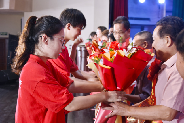 学生代表向荣休教师代表献花
