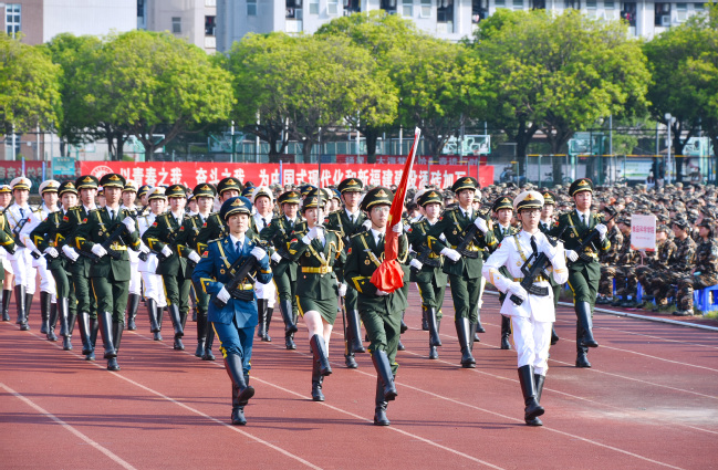 军训团官兵作军训科目示范演示。开学典礼在全体师生共同唱响的《开云网页版校歌》中落下帷幕。