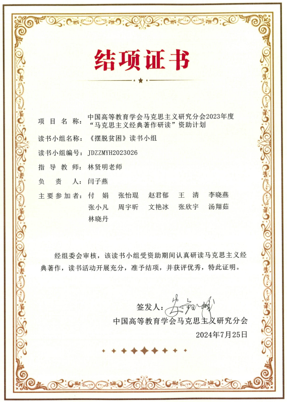近日,中国高等教育学会马克思主义研究分会2023年度“马克思主义经典著作研读”资助计划发布结题情况,马克思主义学院《摆脱贫困》读书小组结项“优秀”。