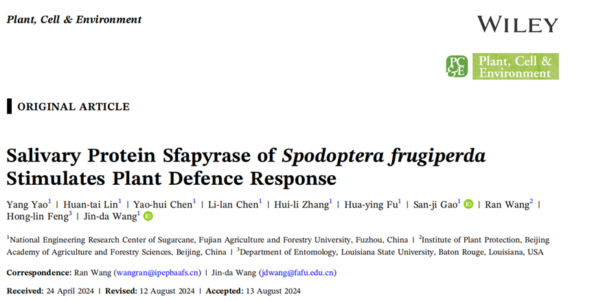 近日,Plant Cell & Environment(植物细胞和环境)在线发表了国家甘蔗工程技术研究中心王锦达团队题为“Salivary protein SfApyrase of Spodoptera frugiperda stimulates plant defense response”(草地贪夜蛾唾液蛋白SfApyrase激发植物防御反应)的研究论文。该研究在草地贪夜蛾的唾液蛋白质组中鉴定出了一种类似Apyrase的蛋白,命名为SfApyrase。这种蛋白主要在唾液腺中表达,并在昆虫取食过程中分泌到植物体内。通过烟草和玉米中的瞬时表达SfApyrase增强了植物的抗性,并导致昆虫取食减少;RNA干扰技术降低SfApyrase的表达,可以增加草地贪夜蛾的生长和取食。此外,研究还表明SfApyrase能够激活茉莉酸信号通路,上调防御相关基因,促进次生抗虫代谢产物,特别苯并恶嗪类化合物的合成,进而激发植物的防御反应,增强对草地贪夜蛾的抗性。研究证实了SfApyrase是一种通过取食分泌到宿主植物中的唾液激发子,可以诱导植物的防御反应,揭示了SfApyrase在植物与昆虫相互作用中的关键作用,为昆虫与植物相互作用的分子机制提供了新的见解,对于农业可持续发展和害虫管理具有重要的实际意义。