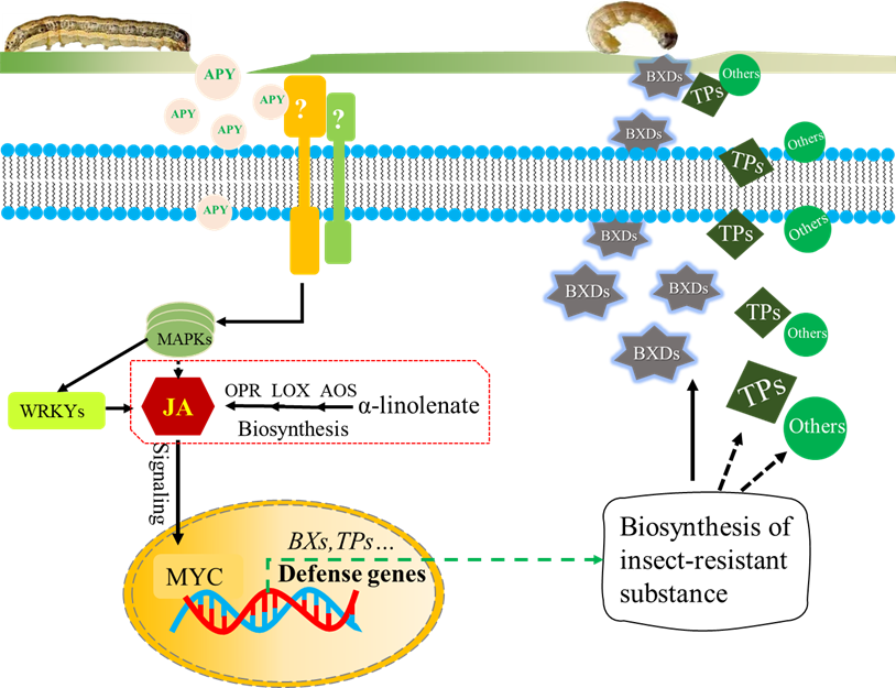 草地贪夜蛾(学名:Spodoptera frugiperda),也称为秋粘虫,是一种原产于美洲热带和亚热带地区杂食性的害虫,对全球玉米、甘蔗、高粱和马铃薯等农作物构成了严重威胁。该害虫于2019年1月传入中国并迅速蔓延,已被我国列入《一类重大病虫害名录》。植物在与昆虫的漫长进化过程中,植物能够通过识别昆虫唾液中的特定化合物触发防御反应。三磷酸腺苷双磷酸酶Apyrase是一种能够催化腺苷三磷酸(ATP)和腺苷二磷酸(ADP)水解生成腺苷一磷酸(AMP)和无机磷的关键酶。而草地贪夜蛾的唾液中的SfApyrase是否参与植物的防御反应,在之前的研究中尚不明确。