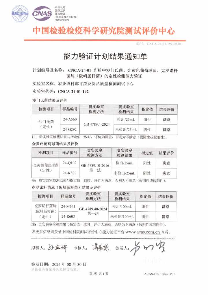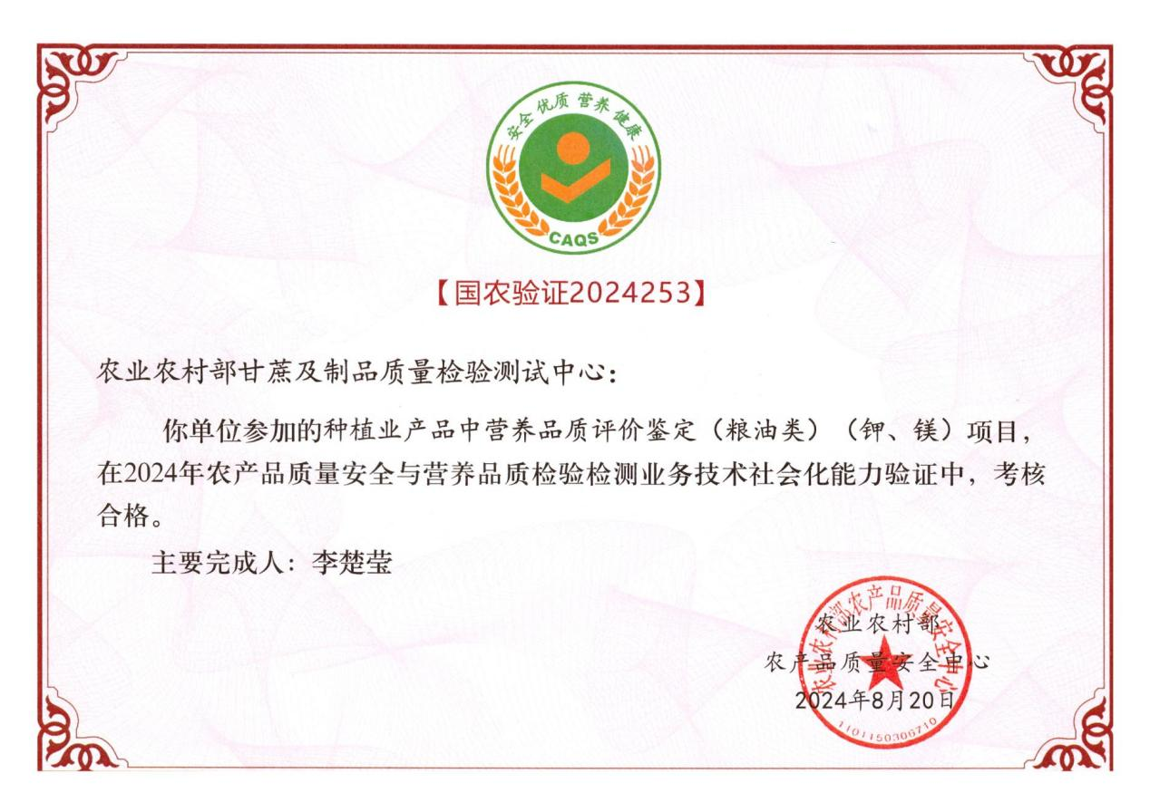 近日,我校农业农村部甘蔗及制品质量检验测试中心(下文简称质检中心)收到中国检验检疫科学研究院测试评价中心、农业农村部农产品质量安全中心的能力验证考评结果。质检中心参加的国家市场监管总局2024年国家级能力验证计划“CNCA-24-01乳粉中沙门氏菌、金黄色葡萄球菌、克罗诺杆菌属(阪崎肠杆菌)的定性检测”和农业农村部农产品质量安全中心2024年农产品质量安全与营养品质检验业务技术社会化能力验证“种植业产品中营养品质评价鉴定(粮油类)(钾、镁)项目”全部获评“满意”结果。