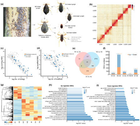 2024年9月12日,黄晓磊教授团队联合中国科学院动物研究所乔格侠研究员在国际生物学期刊 Molecular Eclolgy Resources《分子生态资源》在线发表了题为“Genomic and transcriptomic analyses of a social hemipteran provide new insights into insect sociality”(一种半翅目社会性昆虫的基因组和转录组分析为昆虫的社会性提供了新的见解)的研究论文。利用Nanopore测序技术和Hi-C技术,成功构建了首个半翅目社会性蚜虫的高质量染色体水平基因组,并通过比较基因组分析,结合不同发育阶段和不同型的居竹伪角蚜转录组数据挖掘,揭示了其社会性组织的分子基础,以及孤雌生殖模式下级型分化的基因表达调控机制。
