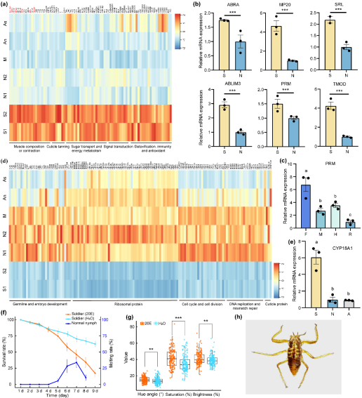 研究结果表明,居竹伪角蚜拥有目前最大的已知蚜虫基因组(582.2 Mb)和高重复序列含量(37.33%)。基因组结构和基因调控在塑造不同级型的表型和发育可塑性方面起着重要作用。基因组分析发现,居竹伪角蚜社会性行为的演化伴随着一些基因家族的重要变化,包括在蚂蚁和白蚁中也观察到的转录因子基因家族的扩张、与转座子(TE)活性相关的基因家族的扩张,以及居竹伪角蚜中特有的糖转运蛋白和尿苷二磷酸葡萄糖焦磷酸化酶(UPGases)的物种特异性扩张。兵蚜和正常若蚜的级型分化与肌肉功能、能量代谢、表皮鞣化、应激耐受性、生殖及多个其他发育途径的基因表达差异有关,且它们被关键基因在表达和进化速率上的改变所调控,这些基因是值得将来深入研究的重要候选基因。尤其是蜕皮激素信号通路中的CYP18A1,可能是调节兵蚜发育停滞的重要候选因子,值得进一步关注。研究结果不仅为理解昆虫社会性的演化机制提供了新的见解,也为未来功能基因研究以及不同社会性昆虫谱系间的综合比较研究提供了宝贵的数据资源。