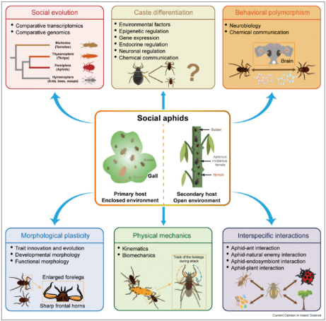 黄晓磊教授团队还在国际期刊Current Opinion in Insect Science《昆虫科学前沿观点》2024年8月发表了题为“Social aphids: emerging model for studying insect sociality”(社会性蚜虫:研究昆虫社会性的新兴模型)的综述论文,全面综述了社会性蚜虫在兵蚜产生的生活史阶段、兵蚜龄期、特化形态、社会性行为(如攻击防御、清洁行为、修补虫瘿等)和生殖分工等方面的多样性。论文指出,相较于其他社会性昆虫,社会性蚜虫在生殖方式、生活环境、级型决定时期和种群组成等方面展现出独特的生物学特性。论文还系统梳理了在环境、生理和分子等层面对社会性蚜虫级型和行为调控方面的最新研究进展,并强调社会性蚜虫作为新兴模型,在探索昆虫社会性演化、级型分化、行为多样性、形态可塑性、生物力学和物种间关系等方面具有重要研究价值,相关方面的研究可能为更广泛的生物学研究提供新视角。开云网页版为论文第一单位,张慧博士和刘志祥博士生为论文共同第一作者,黄晓磊教授为通讯作者,相关研究得到了国家自然科学基金项目的支持。
