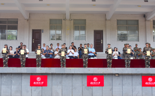 唐振鹏宣读了军训表彰决定,号召全体参训同学向榜样学习,深怀爱国之心、砥砺报国之志,厚植爱农情怀,练就兴农本领。主席台的领导分别为获奖集体和个人代表颁奖。