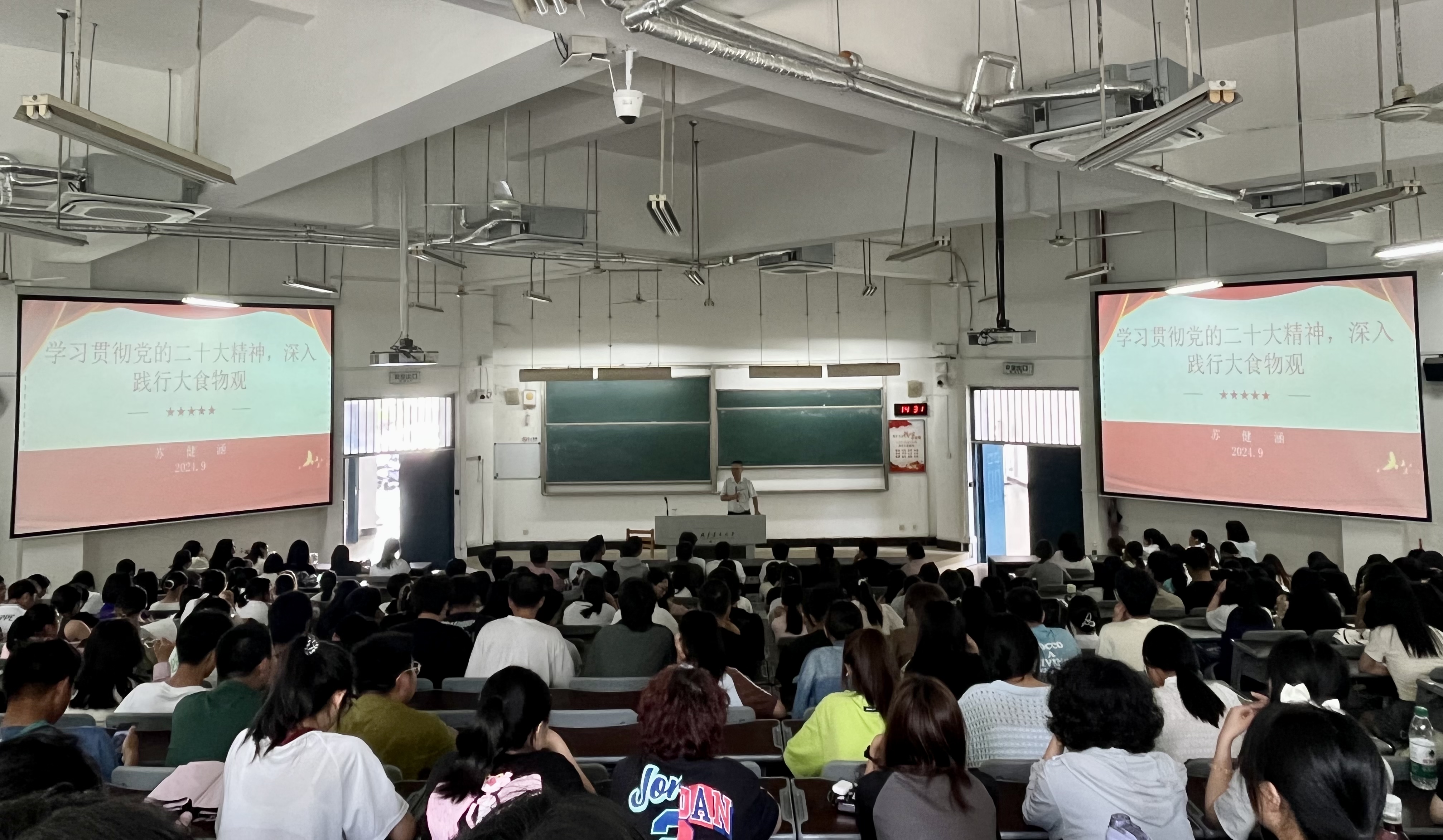 苏健涵首先代表学院对2024级新生圆梦农林大表示热烈欢迎和美好祝愿。他围绕“党的二十大和党的二十届三中全会精神”“‘大食物观’与舌尖幸福”“多元化食物供给体系”“食品专业如何践行大食物观”四个方面展开畅谈,与在座师生共同学习党的二十大报告中的新观点、新论断和新思想。