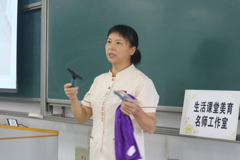张秀宝结合自己30多年的工作经验与学生分享了大学生宿舍保洁的方法和细节,结合PPT演示,讲解了宿舍公共区域墙面的清洁,玻璃楼道顽固污渍的去除,走廊楼梯的卫生维护,宿舍桌子、玻璃擦拭等各类保洁技巧,介绍了抹布、塑料刮刀等实用日常保洁工具的使用方法。