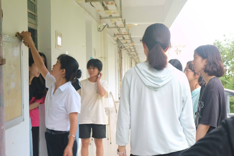 在专业而生动的讲解课后,两位金牌保洁员还带领同学们前往桃区2号、3号楼学生公寓,在学院宿舍包干区域进行实操演练。在实操过程中,同学们积极动手,认真实操,通过亲身体验,同学们不仅掌握了正确的保洁方法,还深刻感受到了劳动带来的成就感和快乐。