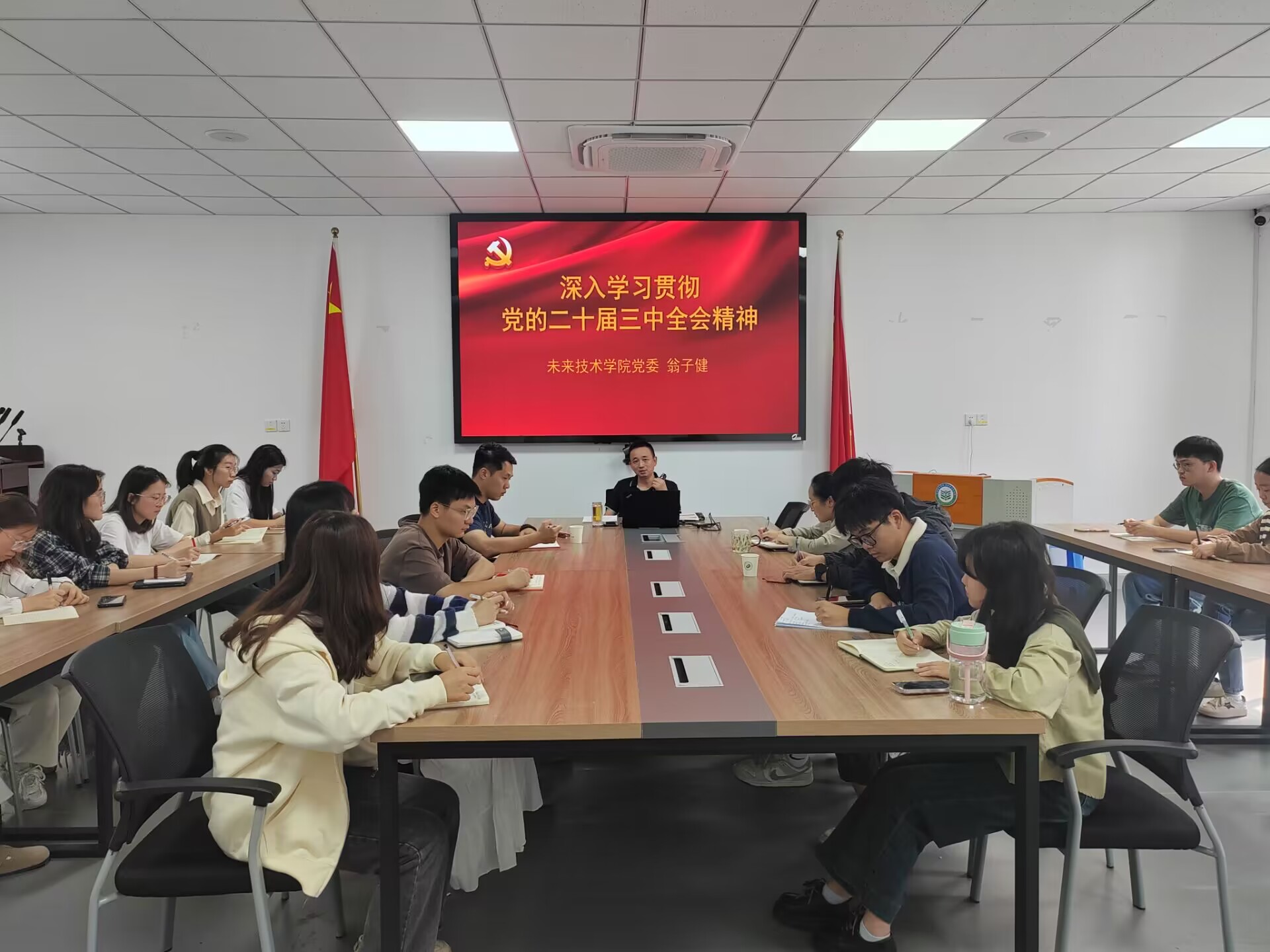 为推动学习宣传贯彻党的二十届三中全会精神走深走实,持续掀起学习贯彻全会精神热潮,10月12日上午,未来技术学院党委书记翁子健在院办210会议室作学习贯彻党的二十届三中全会精神的宣讲报告。学院科级干部,党支部书记、支委,所在研究中心党支部党员共30余人聆听报告。