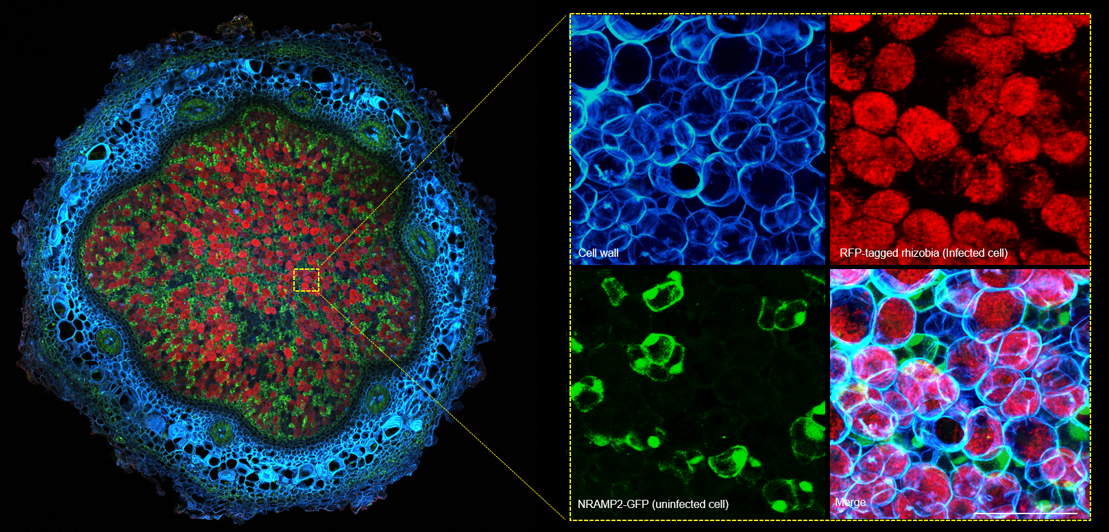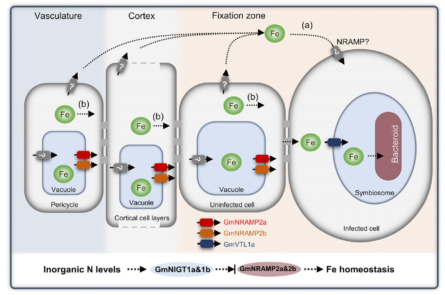 该研究发现,添加无机氮会显著扰乱大豆根瘤中的铁稳态,从而影响共生固氮。这一过程的原因是无机氮抑制了一对铁转运蛋白基因NRAMP2a和2b(以下统称NRAMP2)的表达。NRAMP2主要定位于根瘤非侵染细胞的液泡膜上,影响铁向侵染细胞的转移,从而调节共生固氮的效率。与侵染细胞相比,非侵染细胞的研究长期以来较少受到关注。该研究首次鉴定出特异在非侵染根瘤细胞中的转运蛋白,进一步证明了非侵染细胞在铁储存中的关键作用,为共生固氮过程提供了必要的支持。