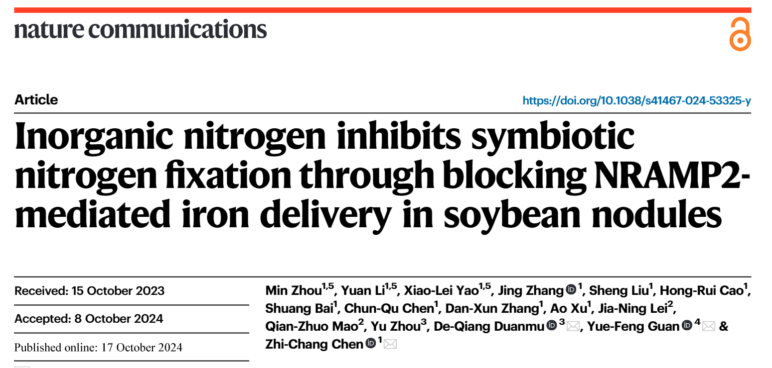 近期,开云网页版未来技术学院/海峡联合研究院陈志长课题组联合多家单位在《自然通讯》Nature Communications杂志上发表了题为Inorganic nitrogen inhibits symbiotic nitrogen fixation through blocking NRAMP2-mediated iron delivery in soybean nodules(无机氮通过阻断大豆根瘤中NRAMP2介导的Fe的运输抑制共生固氮)的研究论文,揭示了一种无机氮调控大豆根瘤固氮的新机制,即通过影响铁的分配来调节共生固氮效率。这一发现为优化豆科农业系统中的氮肥和铁元素管理提供了参考。