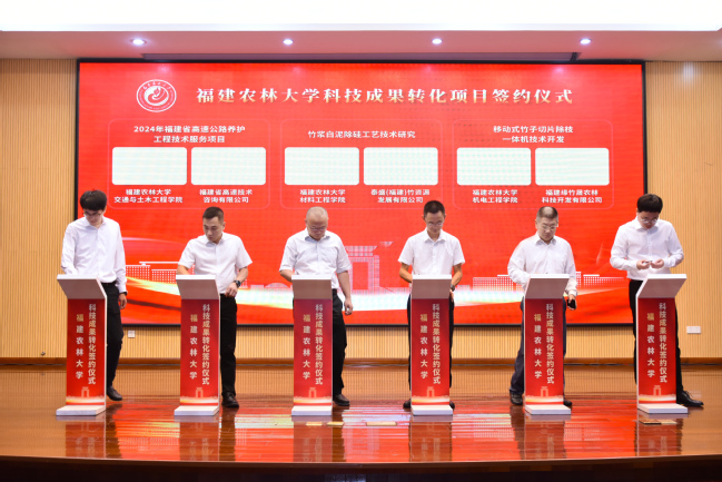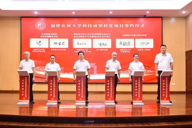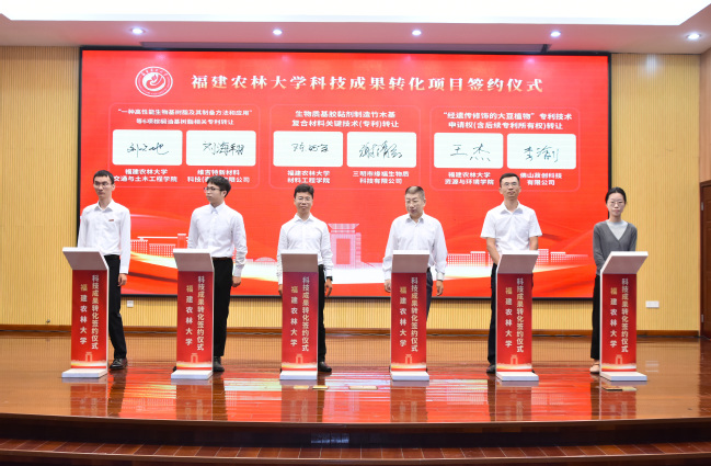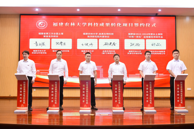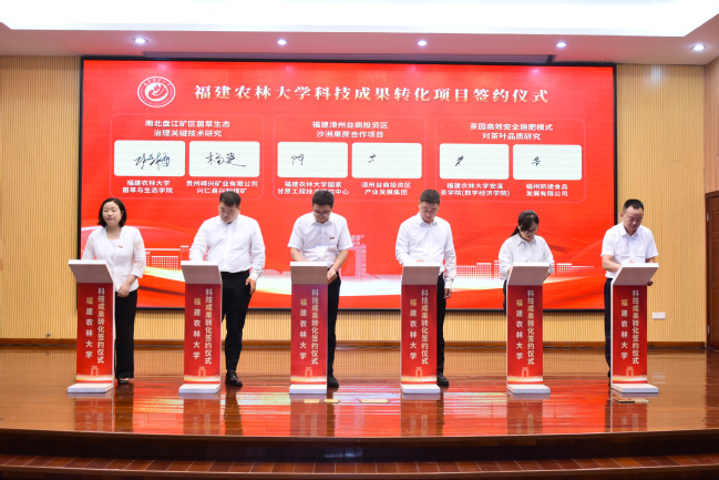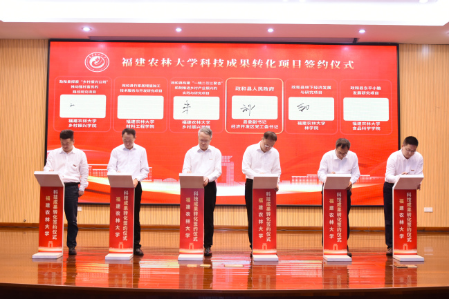 在科技成果转化项目签约仪式上,我校与政和县、仙游县、农业企业等代表,围绕育种技术、种苗繁育、智慧农业、食品加工等领域,完成了成果转化类、技术开发类、技术服务类、校地共建类等四大类型近30个项目签约,合同总金额超1.73亿元。现场签约的有“一种高性能生物基树脂及其制备方法和应用”等6项棕榈油基树脂相关专利转让、生物质基胶黏剂制造竹木基复合材料关键技术转让、“经遗传修饰的大豆植物”专利技术申请权(含后续专利所有权)转让、南北盘江矿区菌草生态治理关键技术研究、茶园高效安全施肥模式对茶叶品质研究等技术成果转化类项目;福建省第三次全国土壤普查系列项目、开云网页版-启真生物科技海洋研究院共建协议、尤溪县酸化耕地治理实施服务项目、食药用兰花产业开发(首期建立血叶兰和石仙桃生产示范基地)技术合作协议、仙游县乡村振兴合作项目、政和县构建“一统二引三聚合”机制推进乡村产业振兴的实践与研究项目等项目委托及校地合作类项目。