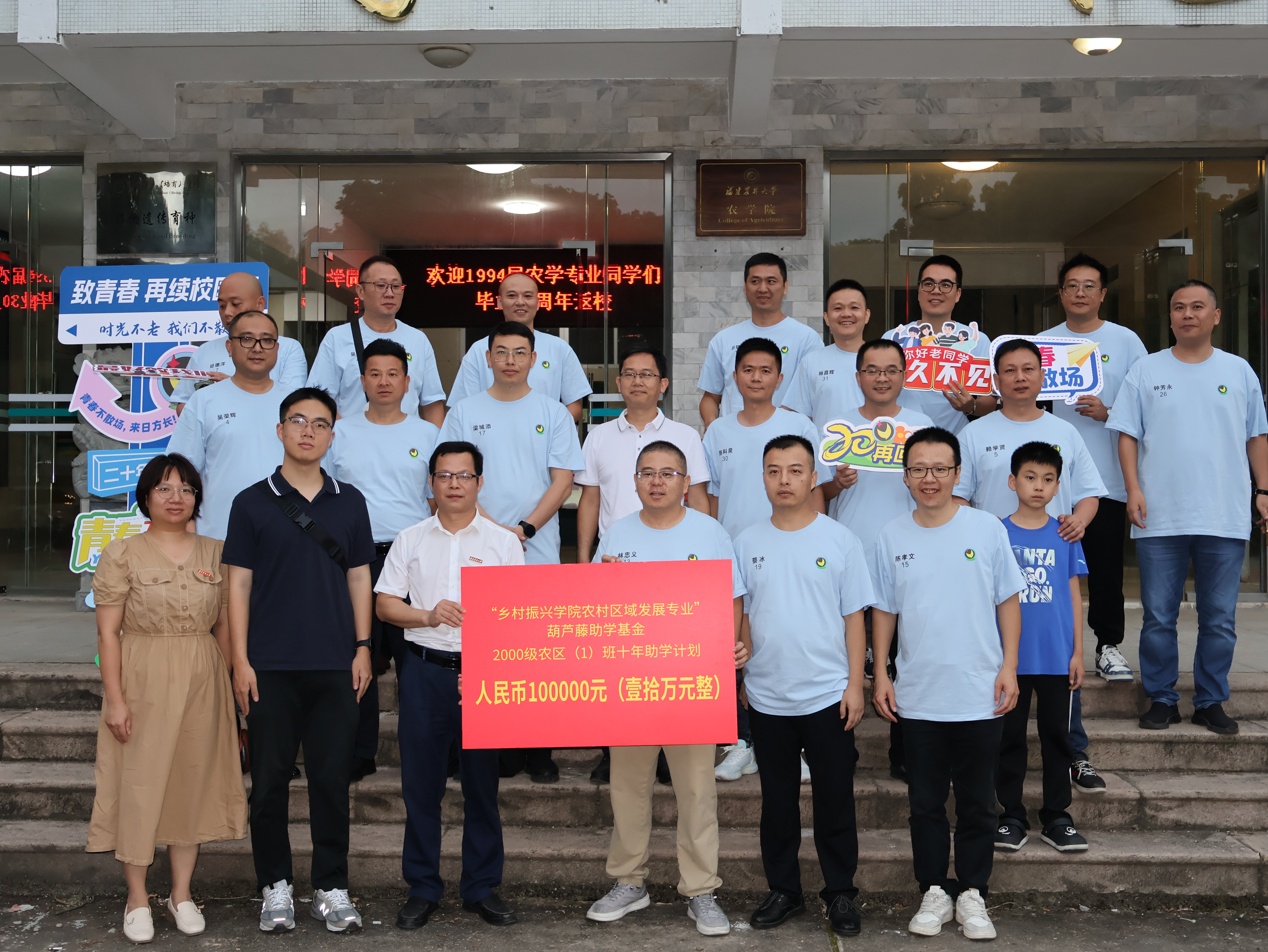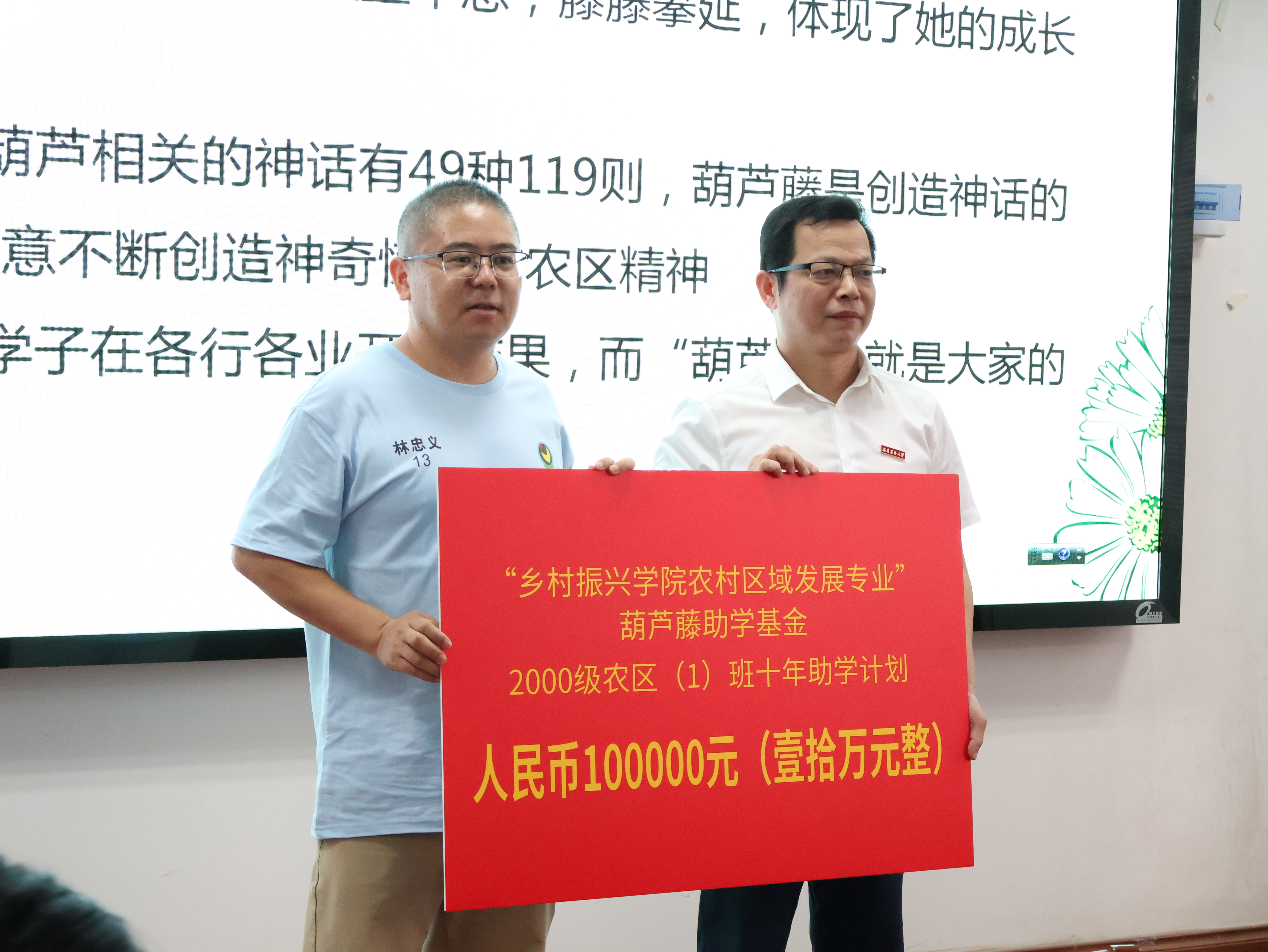 2000级农区优秀校友代表钟芳永汇报了“葫芦藤”助学基金“第二个十年”的助学计划。优秀校友林忠义作为班级代表向学院捐赠人民币10万元整,开启了“葫芦藤”助学基金“第二个十年”的助学计划。