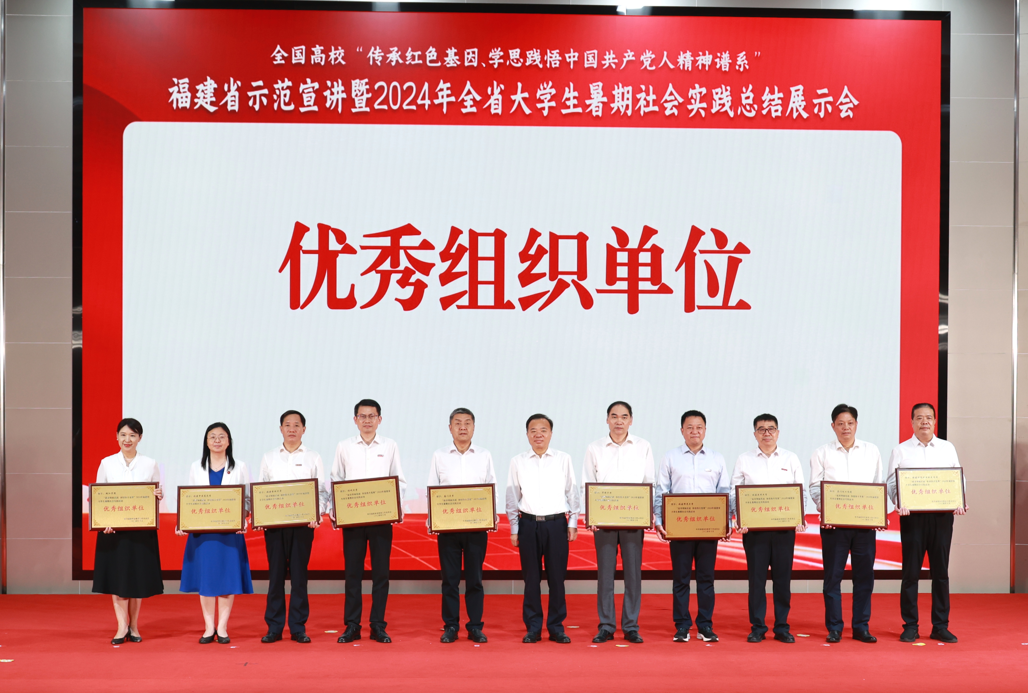 10月19日,全国高校“传承红色基因、学思践悟中国共产党人精神谱系”福建省示范宣讲暨2024年全省大学生暑期社会实践总结展示会举行。省委常委、宣传部部长张彦,教育部思想政治工作司副司长余先亭,省委教育工委书记、省教育厅党组书记、厅长叶燊等领导出席并为优秀组织单位、优秀实践团队、优秀实践教师等获奖代表颁奖。我校党委副书记曾华平参加会议并代表学校领取优秀组织单位奖。