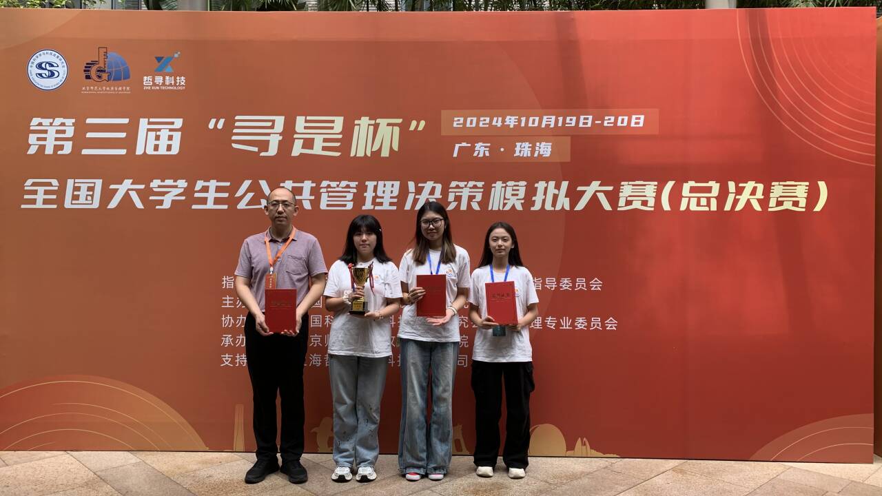 2024年10月18-20日,由教育部高等学校公共管理类专业教学指导委员会指导、中国科学学与科技政策研究会主办、中国科学学与科技政策研究会公共管理专业委员会协办、北京师范大学政府管理学院承办的第三届“寻是杯”全国大学生公共管理决策模拟大赛(总决赛)在北京师范大学(珠海校区)举办。在公共事业管理系郑永平、黄静晗两位老师的指导下,2021级公共事业管理专业张信希、陈诗洋、陈伊三位学生组成的参赛小组在90支队伍中脱颖而出,获得大赛二等奖。此前,该团队在今年4月份华南地区比赛中获得特等奖,首次顺利晋级国赛。