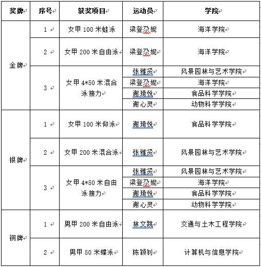 水里冰凉,心里如火,我校运动员们凭借刻苦训练的基本功,在激烈的角逐中拼出风采!特别是女子4X50米混合泳接力,在落后对手较多情况下,最后一棒选手奋勇争先力挽狂澜,一举夺冠,上演了一出惊天翻转大戏。最终夺得3金3银2铜,第4~8名9项,并获团体总分第四名的佳绩。
