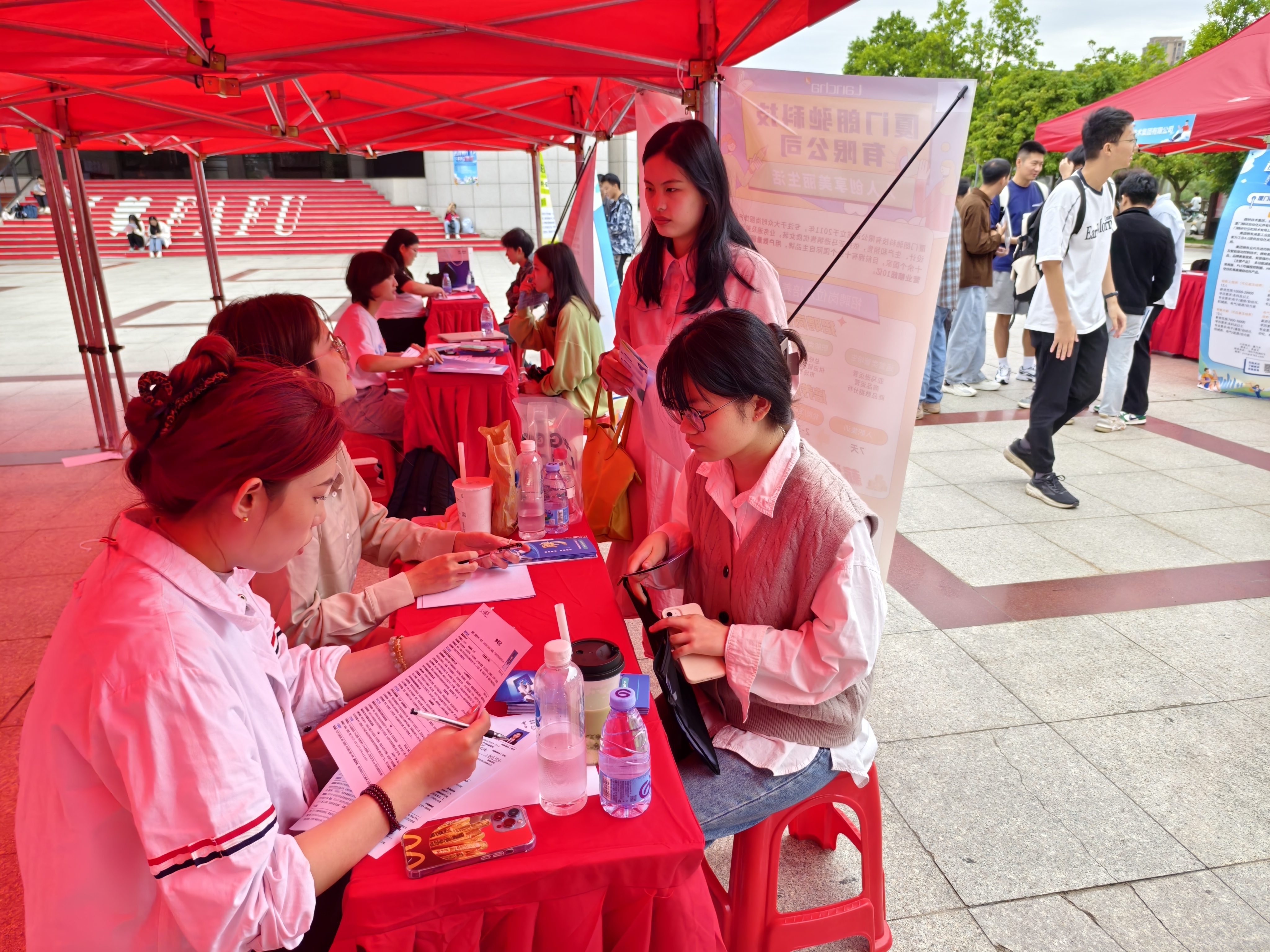 宣讲会上,厦门市人才服务中心直属党委办公室主任苏斐斐就厦门人文、经济和引才政策等进行详细介绍,同时在拓荒广场举办了专场招聘会,共有安井、金牌厨柜、中国平安、中国太平洋等53家用人单位参会,涵盖科技、互联网、教育、金融等多个行业领域,为2025届毕业生提供了1500余个就业岗位。招聘会现场还设置了就业政策咨询点、简历门诊等,帮助毕业生答疑解惑、修改简历、精准帮扶,为毕业生就业创业提供即时的咨询服务。