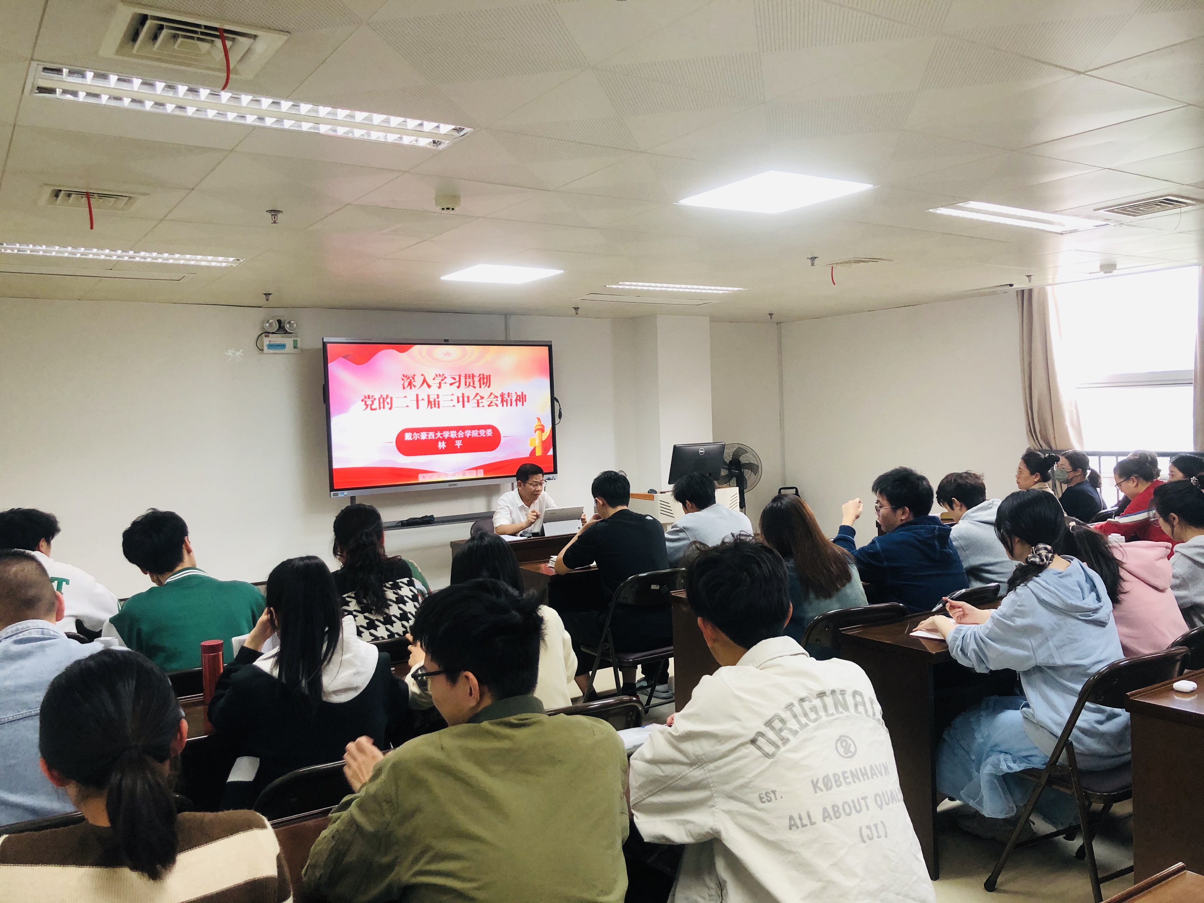11月7日下午,戴尔豪西大学联合学院党委书记林平在旗山综合楼806作党的二十届三中全会精神宣讲报告,联系的国学部全体教师、学生党员代表及团委主要学生干部等30余人聆听。
