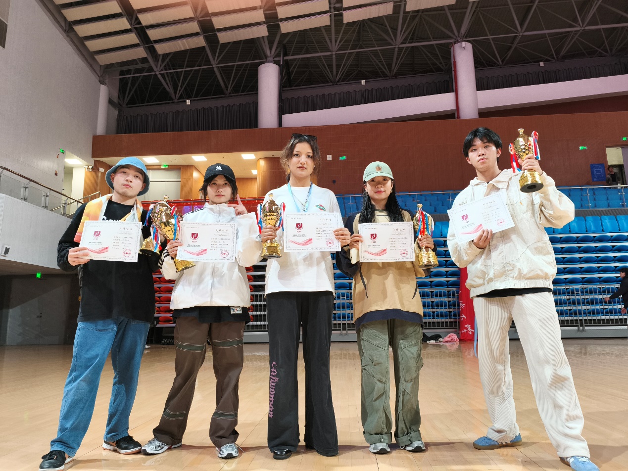 在斗舞比赛中,我校5位队员凭借扎实的基本功和卓越的现场创编能力,动作行云流水般灵活且气势十足,经过海选等多轮一对一斗舞,力压群雄,全部荣获各自项目第一名。