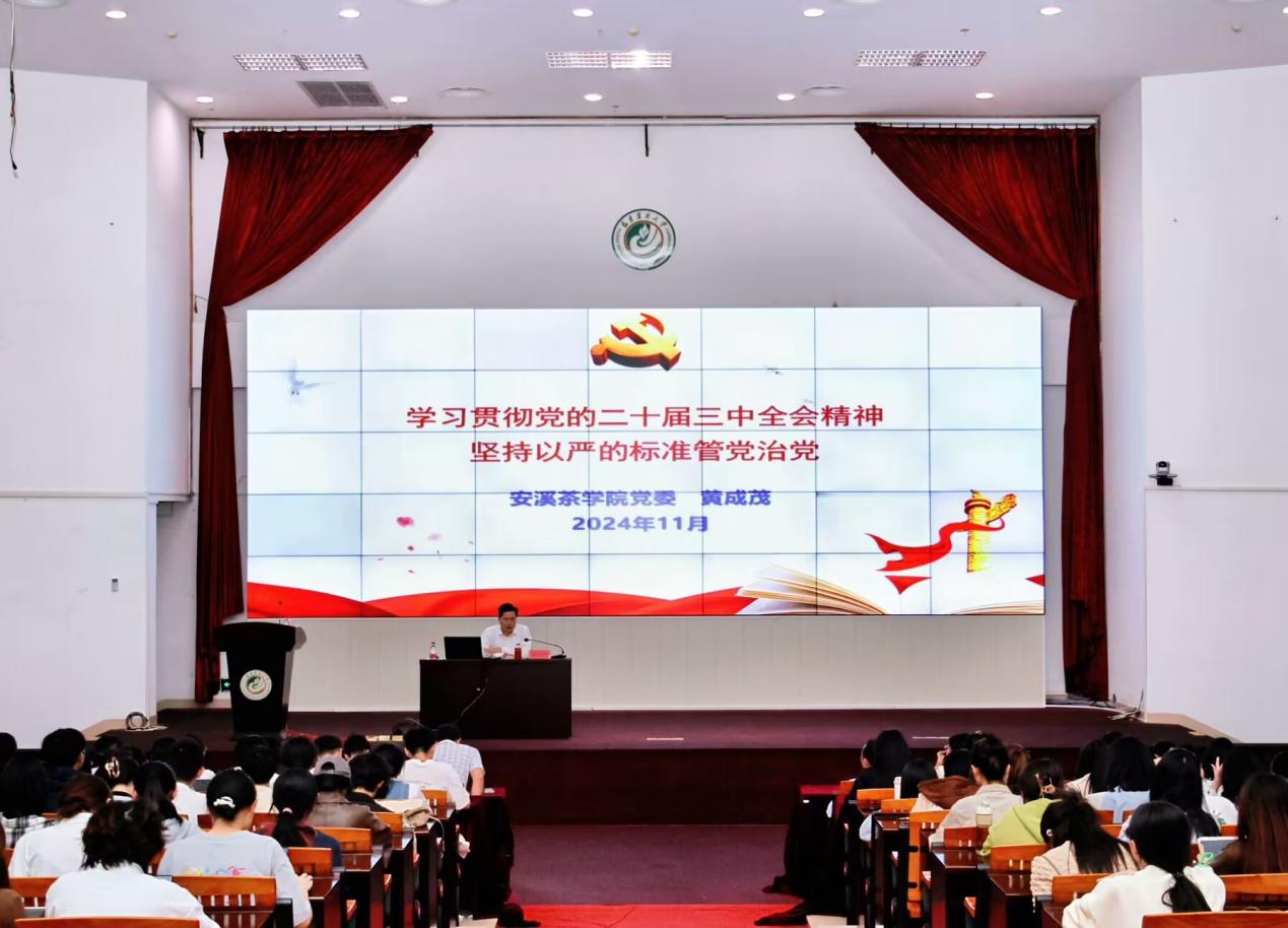 为深入学习贯彻党的二十届三中全会精神,把握全会的精神实质和丰富内涵,安溪茶学院在校区诚智报告厅组织开展书记讲党课活动。安溪茶学院党委副书记(主持工作)黄成茂受邀作主题为《学习贯彻党的二十届三中全会精神 坚持以严的标准管党治党》的党课,全体辅导员、学生党员以及学生代表近300人参加此次活动。