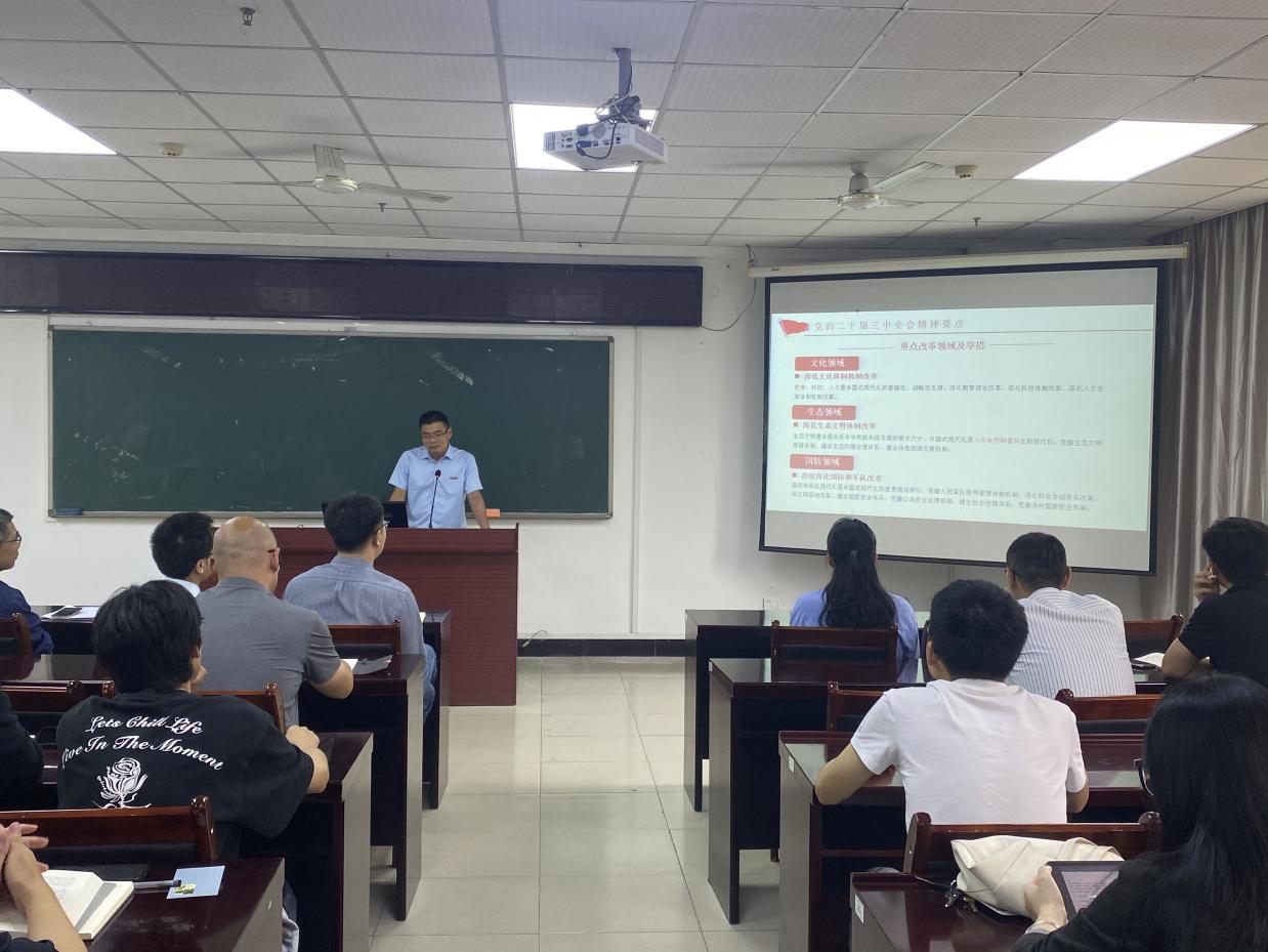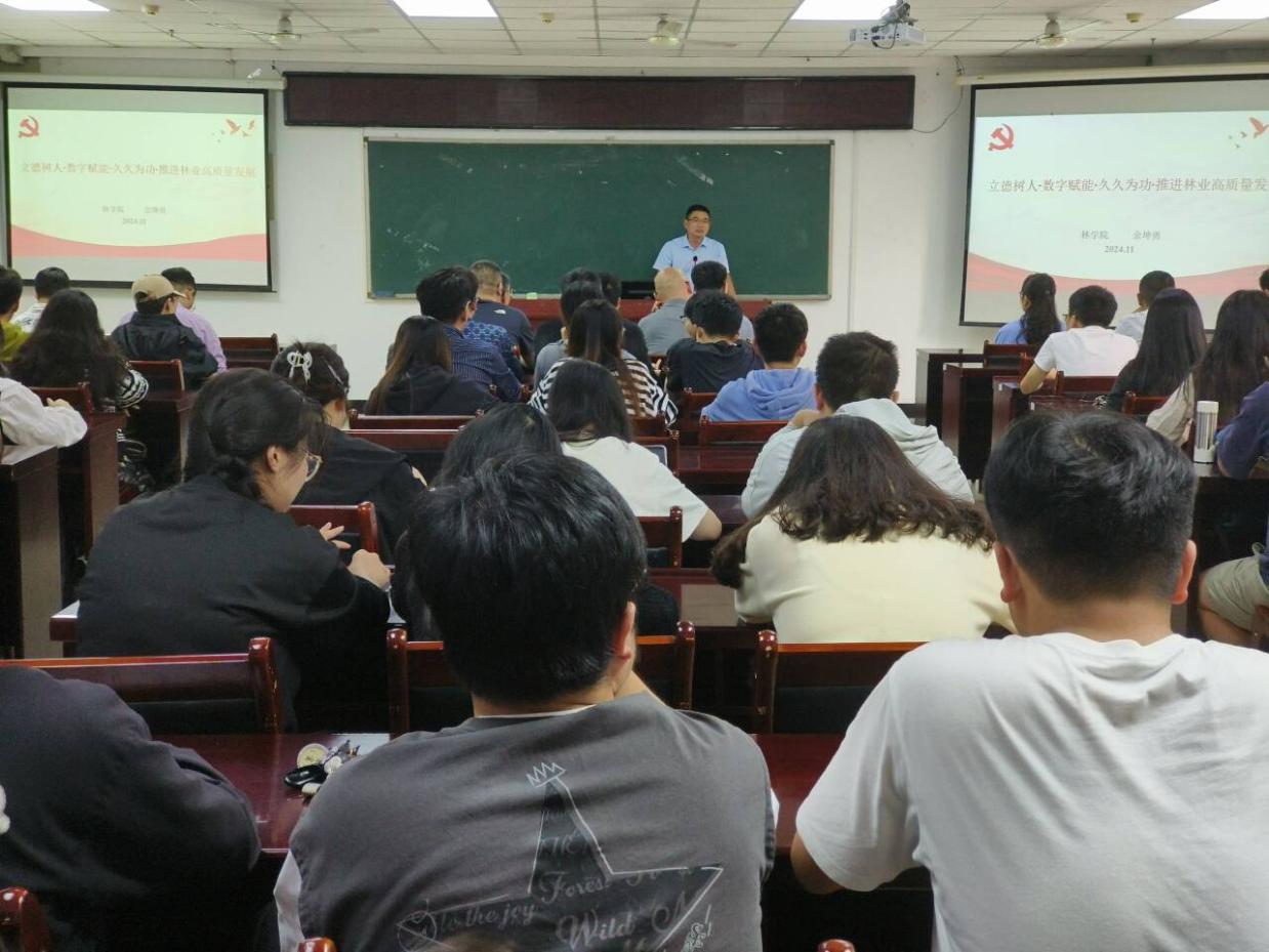 11月14日下午,林学院党委在田家炳教学楼C215教室开展了党的二十届三中全会精神宣讲专题党课,党课由学院党委副书记(主持工作)余坤勇主讲,林学系教工党支部、林学专业本科生党支部、研究生第二、第四支部全体党员及各党支部书记共计90余人参加学习。