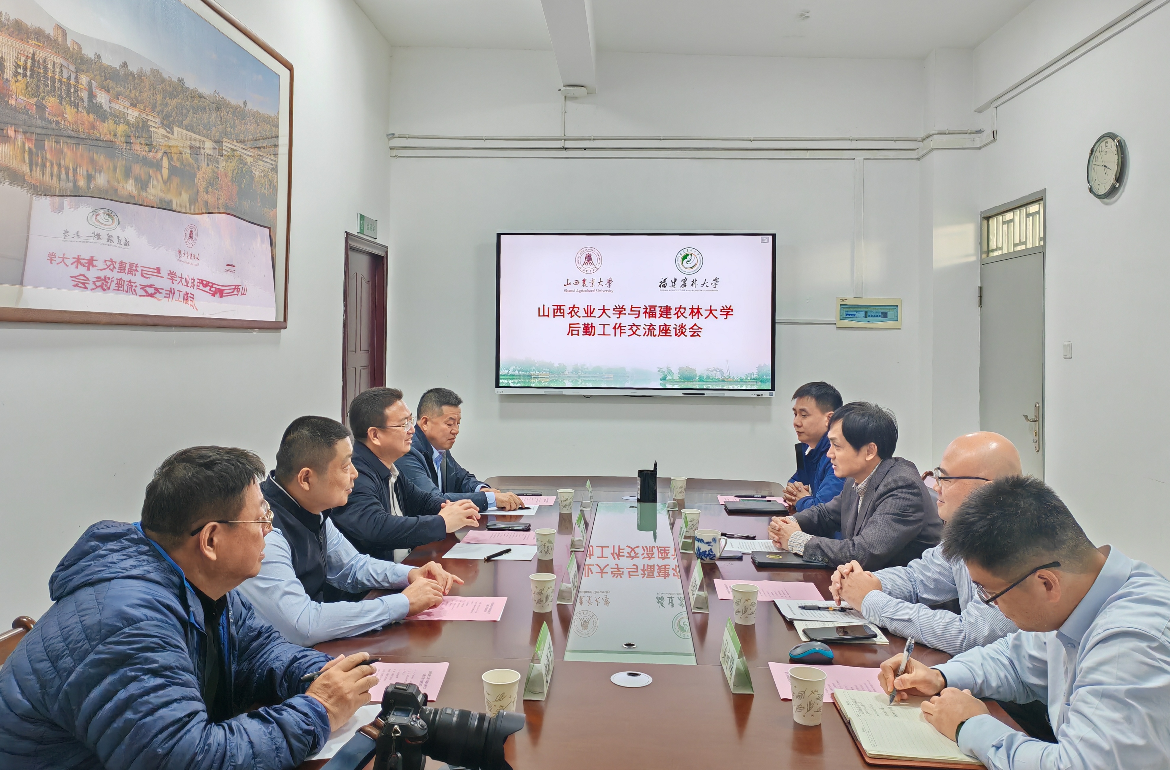 11月26日,山西农业大学后勤保卫部部长陈斌一行到后勤管理处调研交流校园餐饮管理有关工作。后勤管理处处长刘胜、副处长刘键政及相关科室负责同志参加交流座谈。