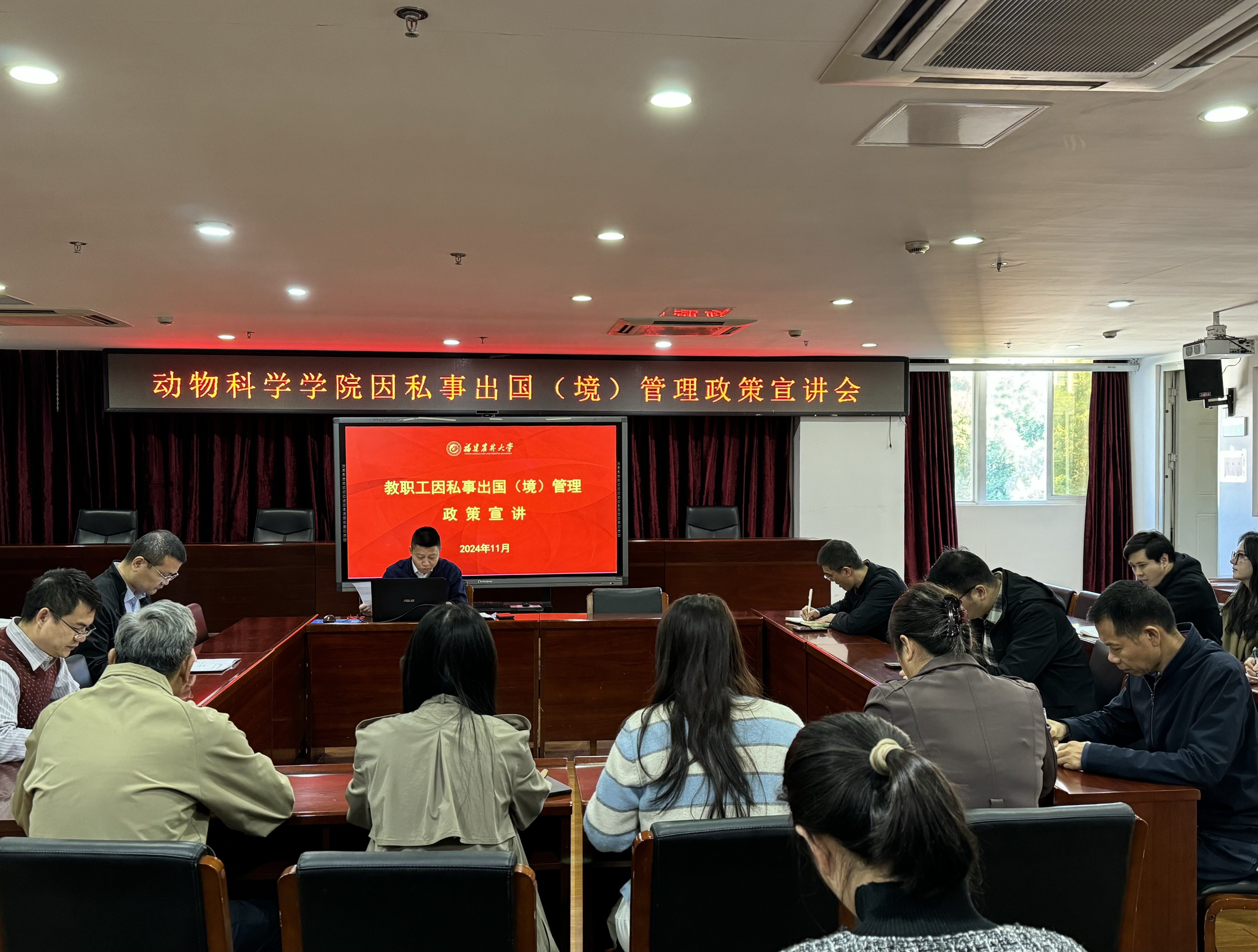 11月28日上午,动物科学学院在动科楼七楼会议室召开教职工因私事出国(境)管理政策宣讲会。学院党政班子成员及全体教职工参加会议,会议由学院党委书记修新田主持。