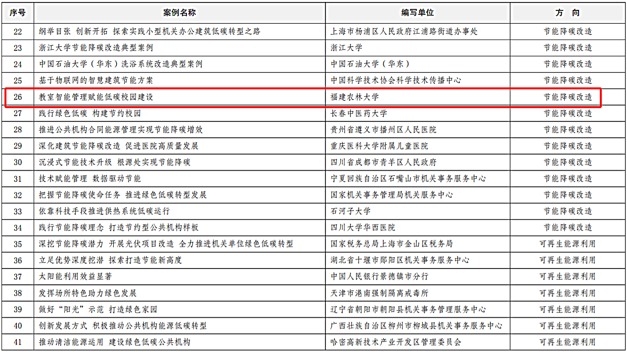 近日,国家机关事务管理局、国家发展改革委发布了2023-2024年度公共机构绿色低碳发展典型案例名单(国管节能〔2024〕194号),我校申报的《教室智能管理 赋能低碳校园建设》案例荣获“2023-2024年度公共机构绿色低碳发展典型案例”。福建省共有4家单位获评“公共机构绿色低碳发展典型案例”,我校是全省教育系统唯一获评典型案例的高校。