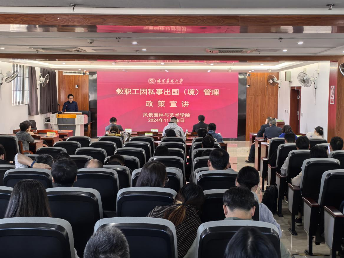 11月28日下午,风景园林与艺术学院在旗山综合楼1204会议室召开风景园林与艺术学院教职工因私出国(境)管理政策宣讲会,由学院党委书记雷国铨主讲,学院全体教职工参加宣讲会。
