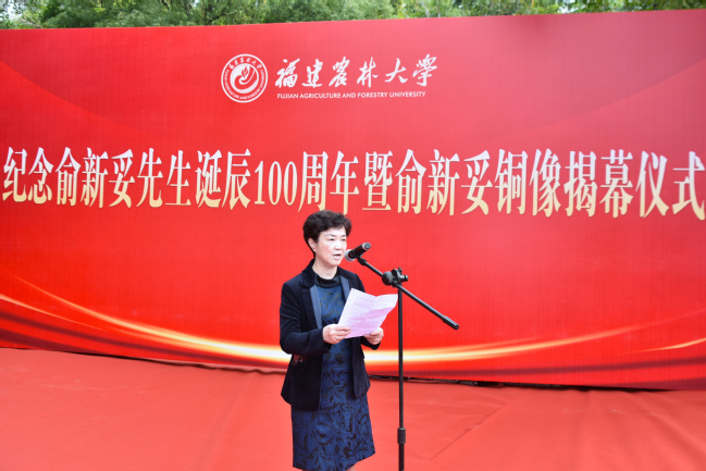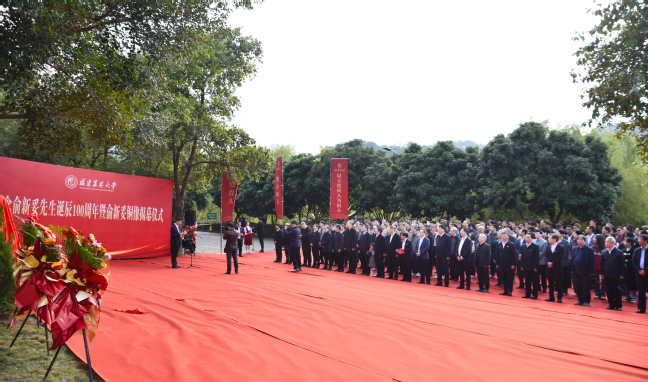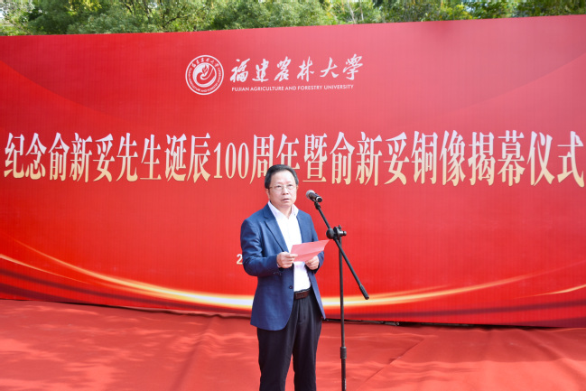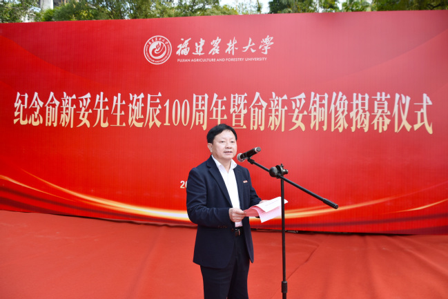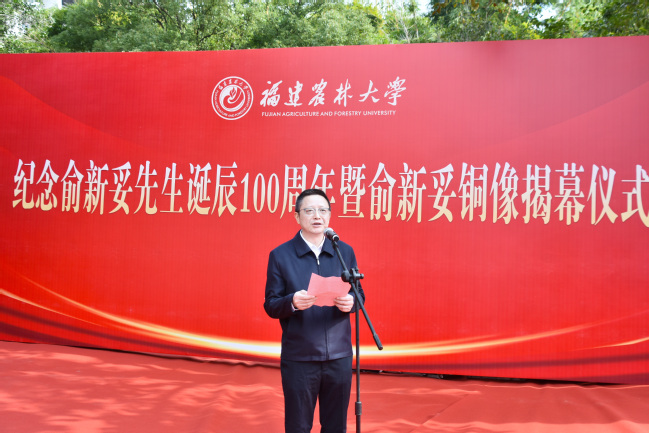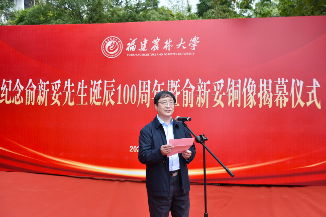 时值我国著名林学家、林业教育家俞新妥先生诞辰100周年之际,12月3日上午,我校在金山校区举行俞新妥先生诞辰100周年纪念铜像揭幕仪式。中国林学会理事长、原国家林业局局长赵树丛,中国林学会副秘书长曾祥谓,政协福建省委员会农业和农村委员会主任、福建省林学会理事长陈照瑜,福建省教育厅副厅长吴伟平,福建省林业局二级巡视员蔡武华,福建省人民政府参事、福建师范大学原党委书记李宝银,省政协教科卫体委员会副主任、省教育厅原副厅长(正厅长级)刘健,福建省农业科学院原党委书记吕月良,莆田学院原党委书记郑才木,福建教育学院原院长余建辉,中国林业科学研究院林业所原所长张建国,南京林业大学原副校长施季森,福建师范大学原党委副书记廖福霖,福建中医药大学原副校长梁一池,我校全体在家校领导,原副校长林思祖,福建省生态工程职业技术学校原党委书记、校长俞白楠女士和国际竹藤中心范少辉研究员为代表的俞新妥先生家人、学生、好友,以及学校各部处、学院负责人和杉木中心师生代表等100多人参加揭幕仪式。揭幕仪式由副校长林庆藩主持。