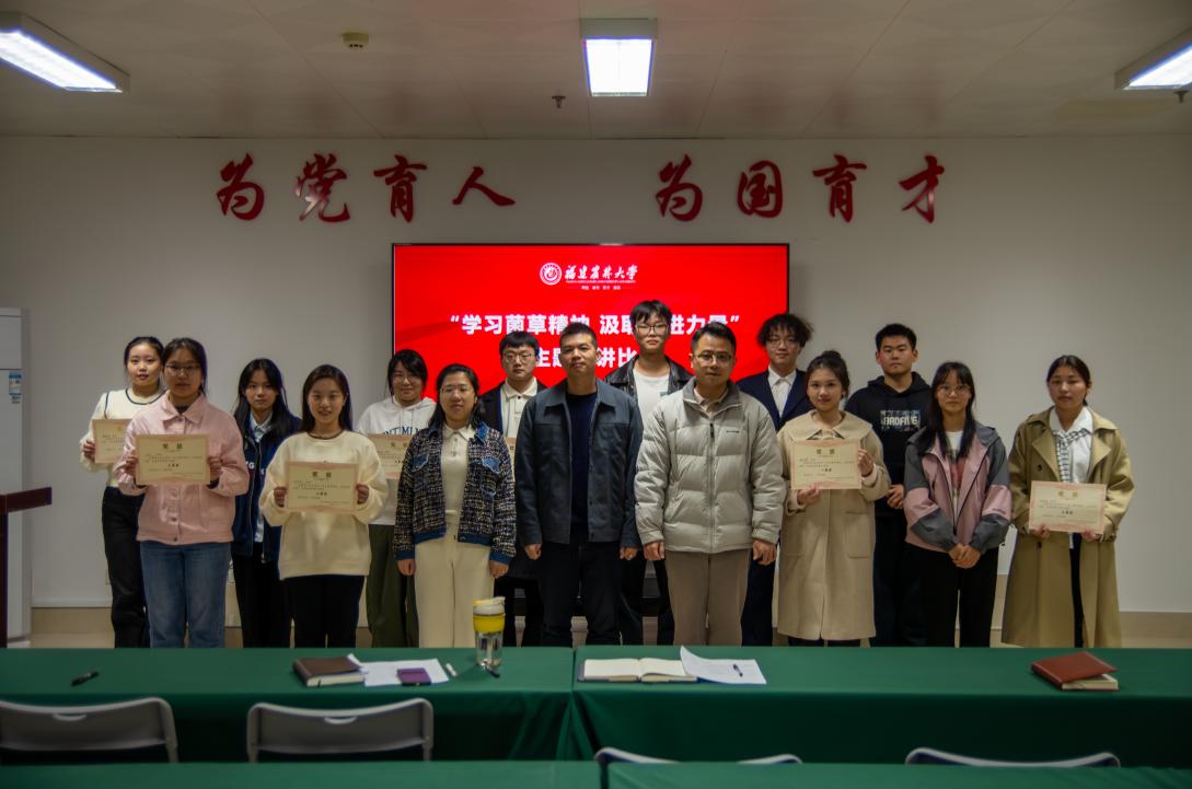 11月29日晚,菌草与生态学院在金综楼B401会议室举办“学习菌草精神,汲取奋进力量”主题演讲比赛,学院团委副书记杨小飞,辅导员林俏丽、徐敏睿、陶静及师生代表共50余人参加活动。