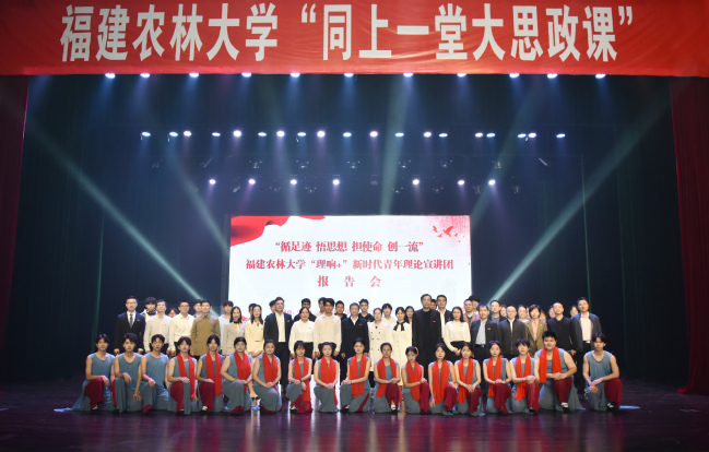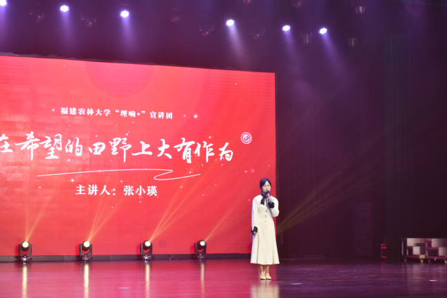 马克思主义学院的雷娜老师以“铺就绿意盎然的致富路”为题,带我们走进宁德周宁黄振芳家庭林场,感受我校在建设森林“水库、钱库、粮库、碳库”中的担当作为。陈文老师以“践行大食物观,农林大人在行动”为题,讲述了我校师生用科技力量助力“海上福建”建设所作出的贡献。张小瑛老师以“在希望的田野上大有作为”为题,结合我校菌草、科技特派员等案例,讲述我校师生牢记嘱托,感恩奋进,推动教育科技人才一体发展,在推动农业农村现代化中砥励奋进的生动实践。夏艳老师以“科特派:领着农民干 带着农民赚”为题,讲述我校根系生物学中心主任廖红教授把论文写在田野大地上的精彩故事。菌草与生态学院(碳中和研究院)的博士研究生谢粤斌同学以“一稻割两季 土里再生金”为题,讲述我校浦城再生稻科技小院师生们推动科技创新与产业创新深度融合的故事。学工部职业指导教研室蔡湄湄老师以“立志科技兴农 赋能乡村振兴”为题,讲述了国家甘蔗产业工程技术研究中心奋力占领全国甘蔗科学制高点的故事。马克思主义学院的付信彬老师以“做强种业‘芯’打好翻身仗”为题,介绍一个关于如何打破国外种子垄断,实现国产“芯”崛起的励志故事。孙巧真老师以“小小的种子 大大的希望”为题,讲述谢华安院士致力水稻育种创新,让中国人端牢自己的饭碗,推动中国水稻种业屹立世界之巅的感人故事。宣讲会上,交通与土木工程学院阡陌艺术团表演了精彩的舞蹈《我心中的红》,将现场气氛推向高潮。