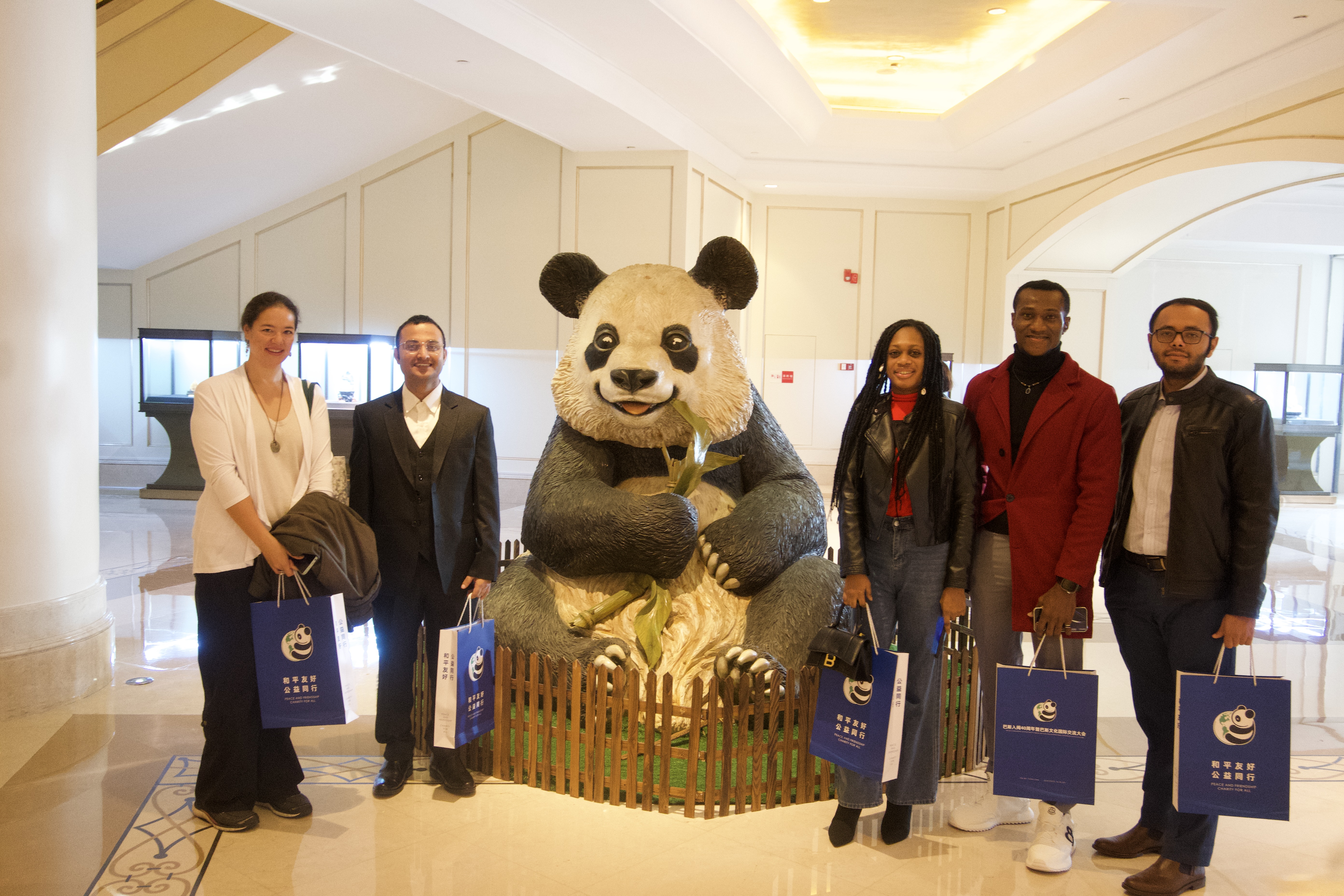 参会留学生与熊猫巴斯塑像的合影