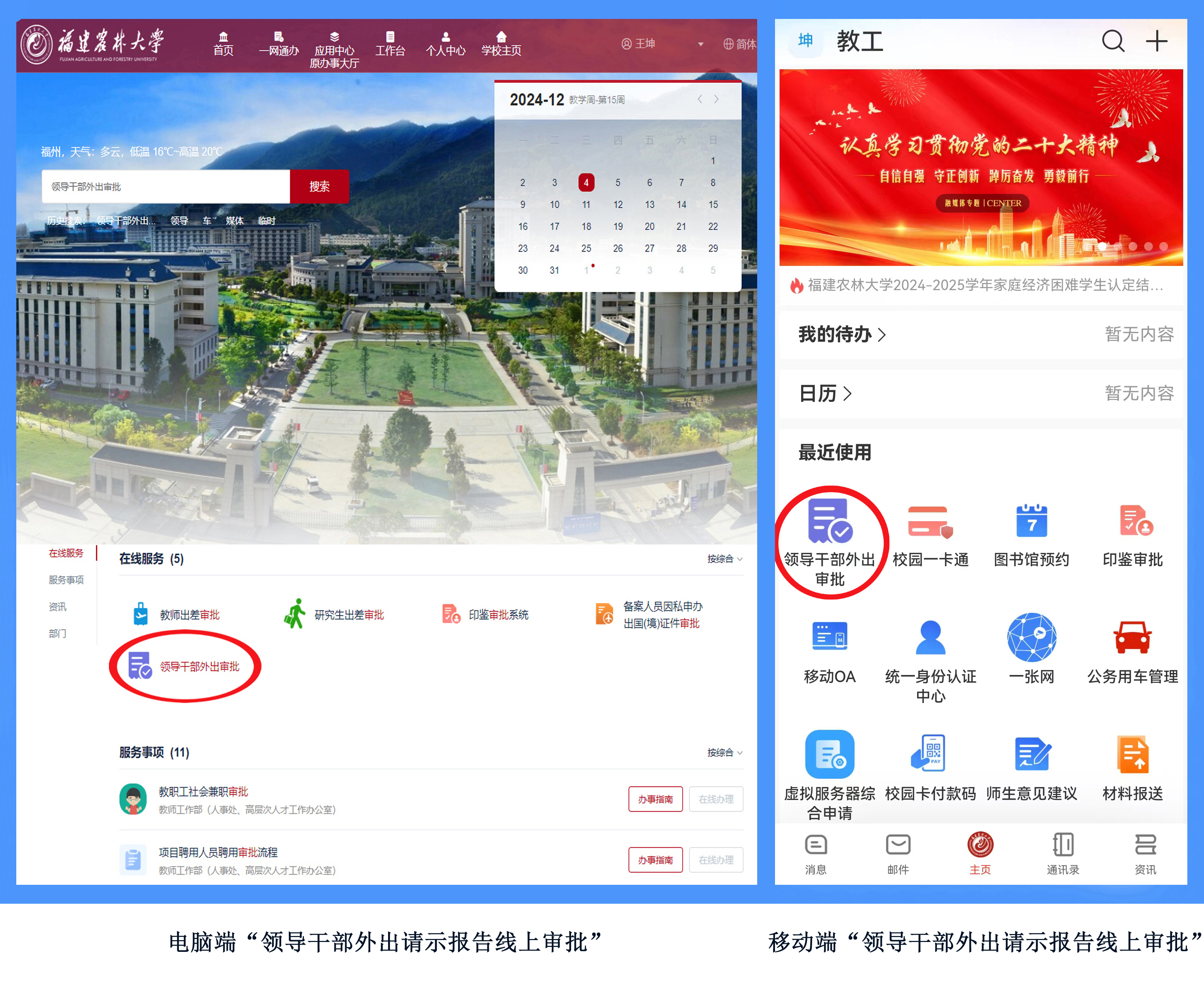 为方便领导干部在加强对外交流时的外出请示报告,我校正式启动领导干部外出请示报告线上审批。领导干部外出请示报告线上审批适用范围为中层副职及以上干部,可通过移动端“数字FAFU”APP和电脑端“一网通办”两种方式办理。在上述“两端”界面中搜索或查找“领导干部外出审批”按钮,根据提示选择外出类型,输入或选择相关内容即可,操作简单、快捷。