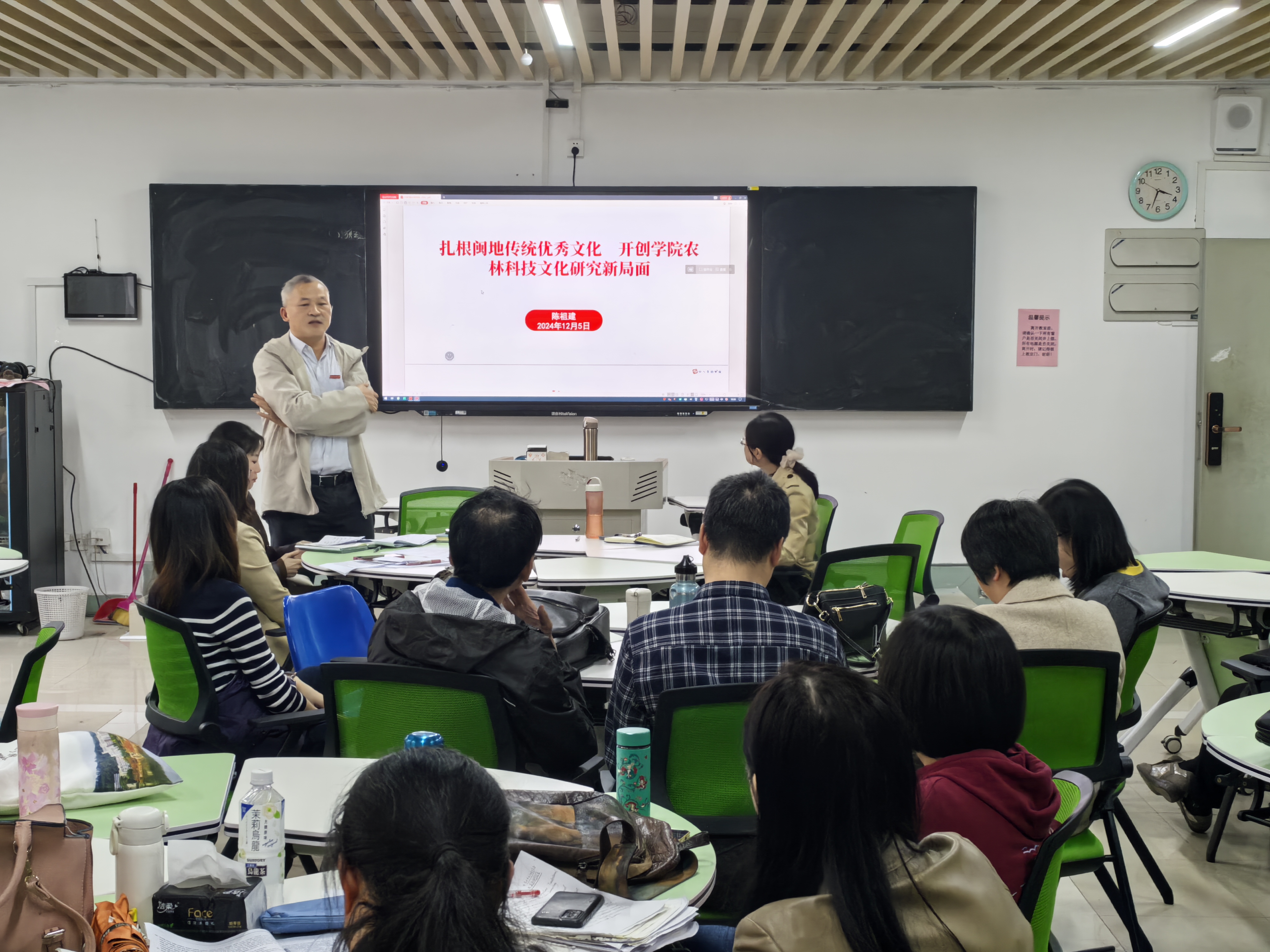 陈祖建为全体与会教师做了题为《扎根闽地优秀传统文化,开创学院农林科技文化研究新局面》的专题讲座。他分析闽地文化形成的影响因素并介绍丰富的福建非物质文化遗产,建议与会教师深耕闽地某一非物质文化遗产,用敢为人先的科学态度和脚踏实地的研究方法,争做学院闽地农林文化科学研究的奋斗者、行动派和实干家,开创学院农林科技文化研究新局面。