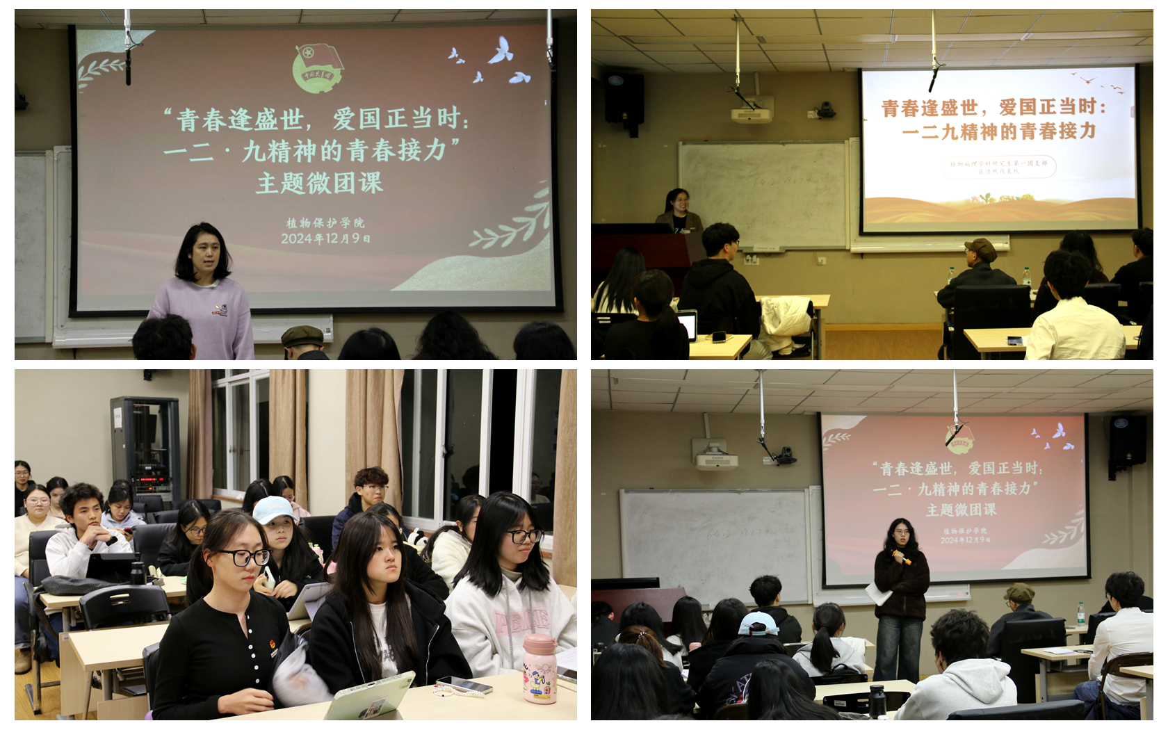 为深入学习“一二·九”精神,引导青年学子铭记历史,继承和弘扬伟大爱国主义精神,12月9日晚,植物保护学院在博学楼704开展“青春逢盛世,爱国正当时:一二·九精神的青春接力”主题微团课活动,学院辅导员与各年级同学共60余人参与本次活动。