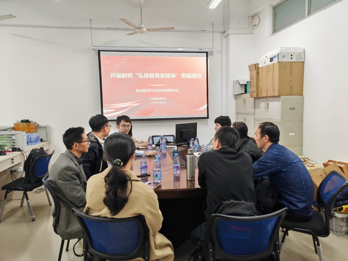 随后,会议进入“弘扬教育家精神”专题培训环节。森保系教师共同学习了教育家精神的内涵和重要性,教育家精神是教育工作者应该具备的一种高尚品质,它包括了热爱教育、献身教育、勇于创新、甘于奉献等多个方面。会上教师们认为作为森保系的教职工,要时刻铭记教育家精神,不断提升自己的专业素养和教学能力,为培养更多优秀的林业人才贡献自己的力量。