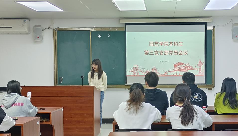 12月6日,园艺学院本科生第三党支部在园艺楼214会议室召开党支部主题党日活动,专题学习党的二十届三中全会精神及《中国共产党党员教育管理工作条例》。会议由支部书记罗冰筠主持,全体党员参加。