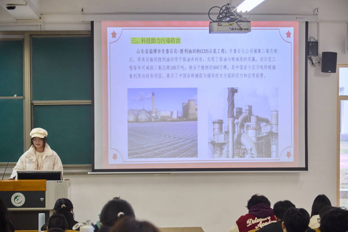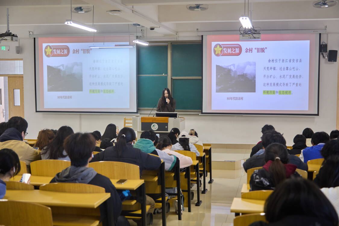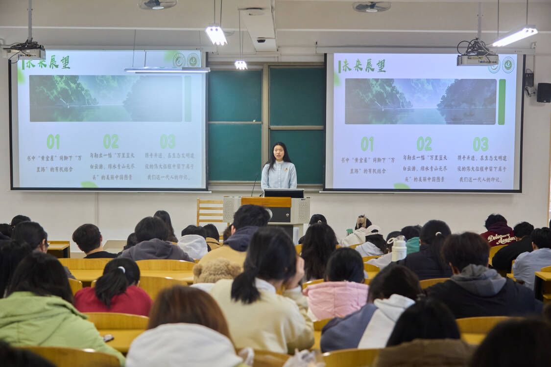 宣讲活动由来自马克思主义学院、经济与管理学院以及计算机与信息学院的宣讲小分队共同呈现。他们围绕习近平生态文明思想,从理论到实践,从国家大局到地方案例,再到科技创新与法治保障,进行了全方位、多角度的深入解读。冯婧雯同学以北京冬奥会的“绿色办奥”为例,生动展现了习近平生态文明思想的实践魅力;程美玲同学通过三明市的成功案例,揭示了生态文明建设在地方实践中的生动图景;徐依晴同学则聚焦清洁能源开发和生态旅游发展,阐述了科技创新与法治保障在生态文明建设中的重要作用。宣讲内容深入浅出,案例生动鲜活,赢得了同学们的阵阵掌声。