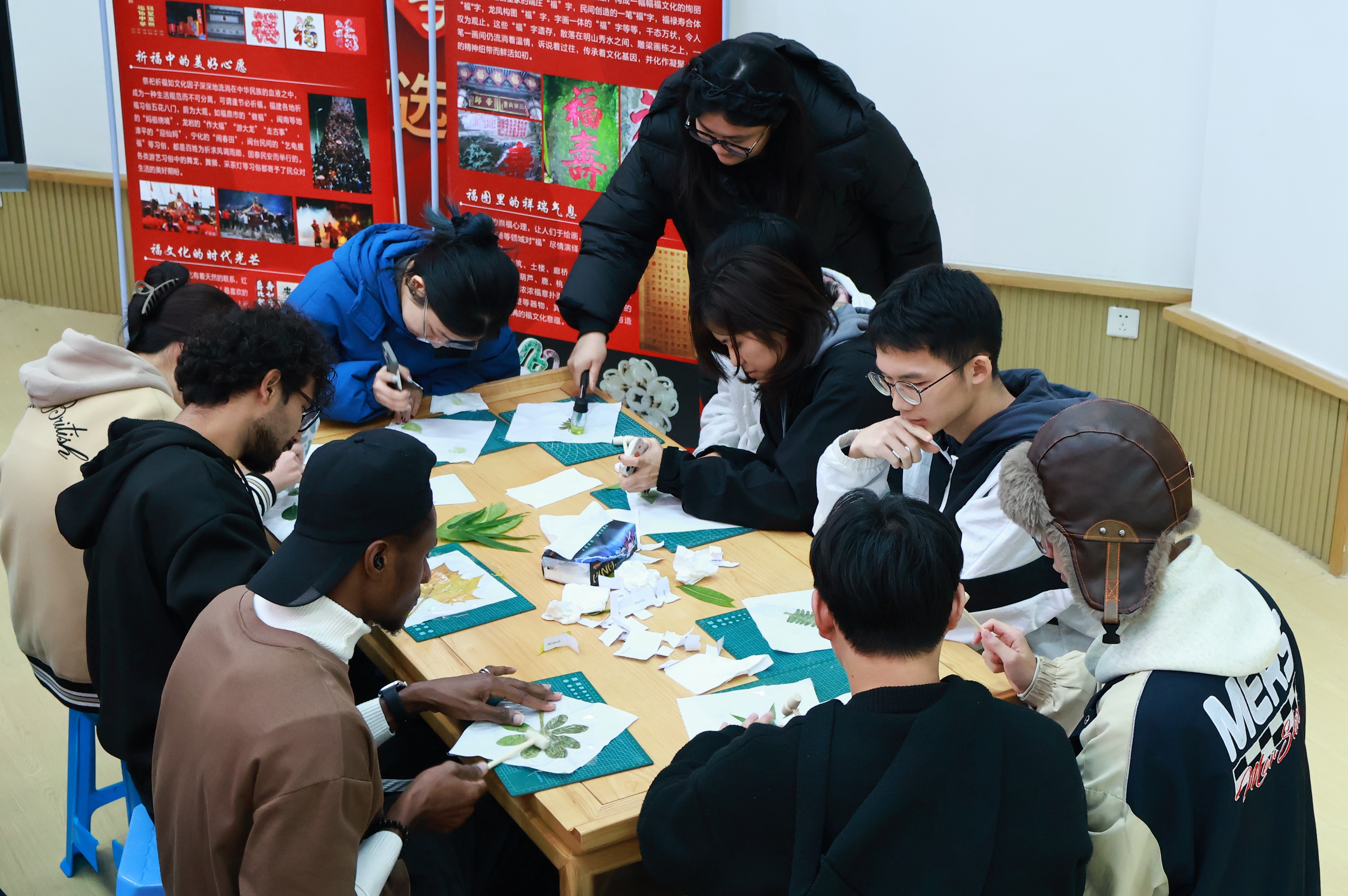 12月15日下午,戴尔豪西大学联合学院(国际学院)“一带一路”留学生“福”文化研习社邀请校大学生环境保护协会共同开展主题为“叶拓自然韵 彩染敬冬时”汉语角活动,活动在学院金山校区“一站式”学生社区进行,吸引我校中外学子一同参与。