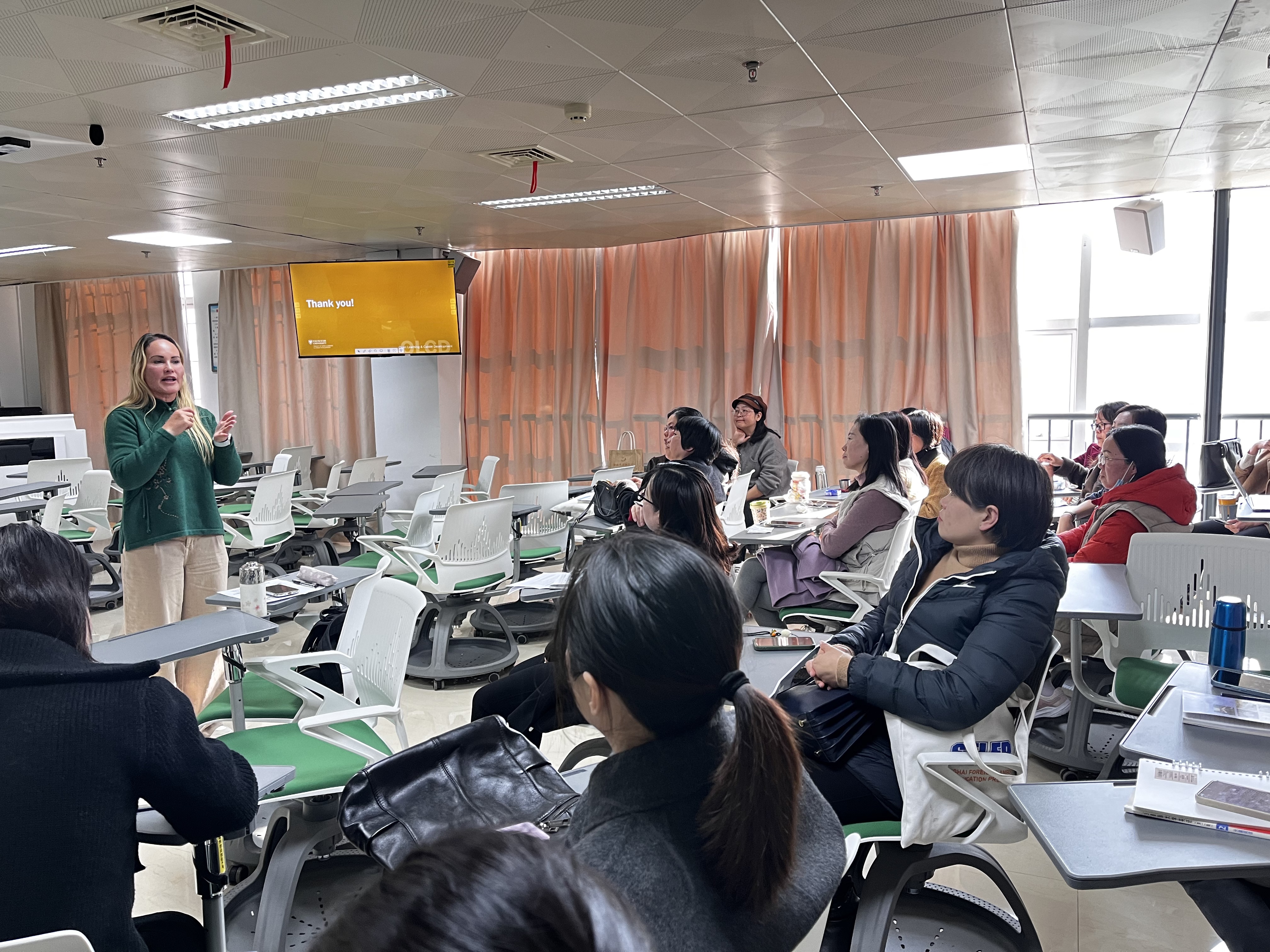 12月18日下午,加拿大戴尔豪西大学教师Sandra Borges在旗山校区综合楼810教室为学院教师举行英语教学观摩课,授课主题为“跨文化交际能力”。Sandra Borges是戴尔豪西大学语言中心优秀的语言教师,拥有20余年的英语教学经验。此次观摩课吸引了近30名教师的热情参与。