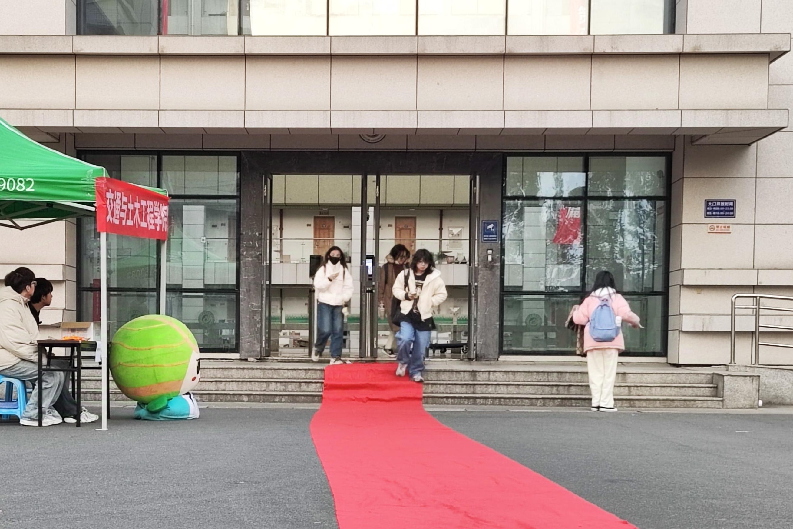 热情送考,筑梦启航。考试当天,学院在宿舍楼门口铺设红毯,部分学子在现场暖心送考,为即将踏上考场的考生送上祝福与鼓励,并为考生准备了茶水与考试用品,做好后勤助力。红毯的铺设为考生们营造了庄重而热烈的氛围,更加坚定考研学子们追逐梦想的决心和勇气。
