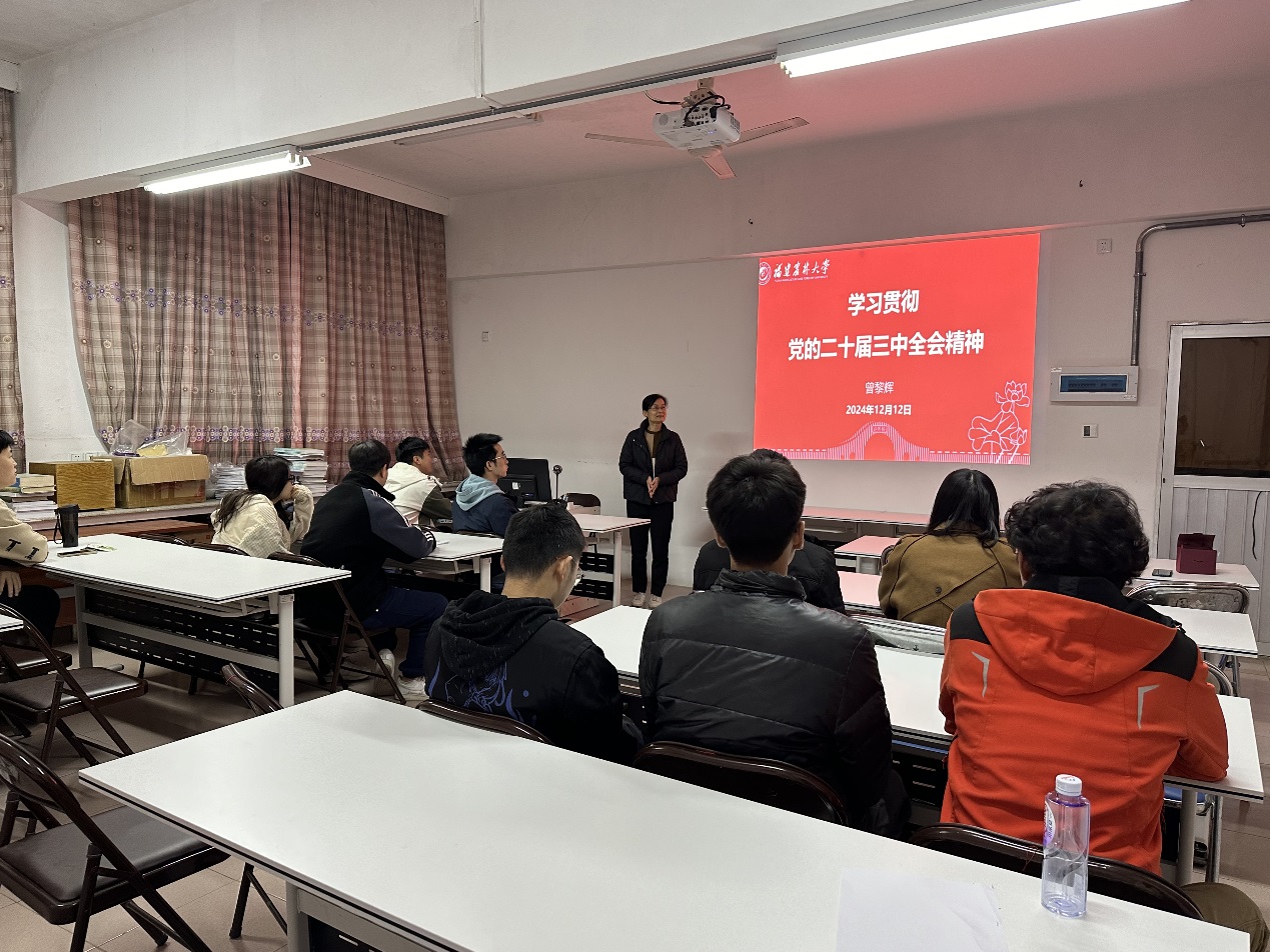 为深入学习贯彻党的二十届三中全会精神,12月12日晚,园艺学院党委委员、副院长曾黎辉为园艺植物遗传育种党支部作党的二十届三中全会精神宣讲报告,宣讲会由支部书记方庭主持,支部全体党员参加。