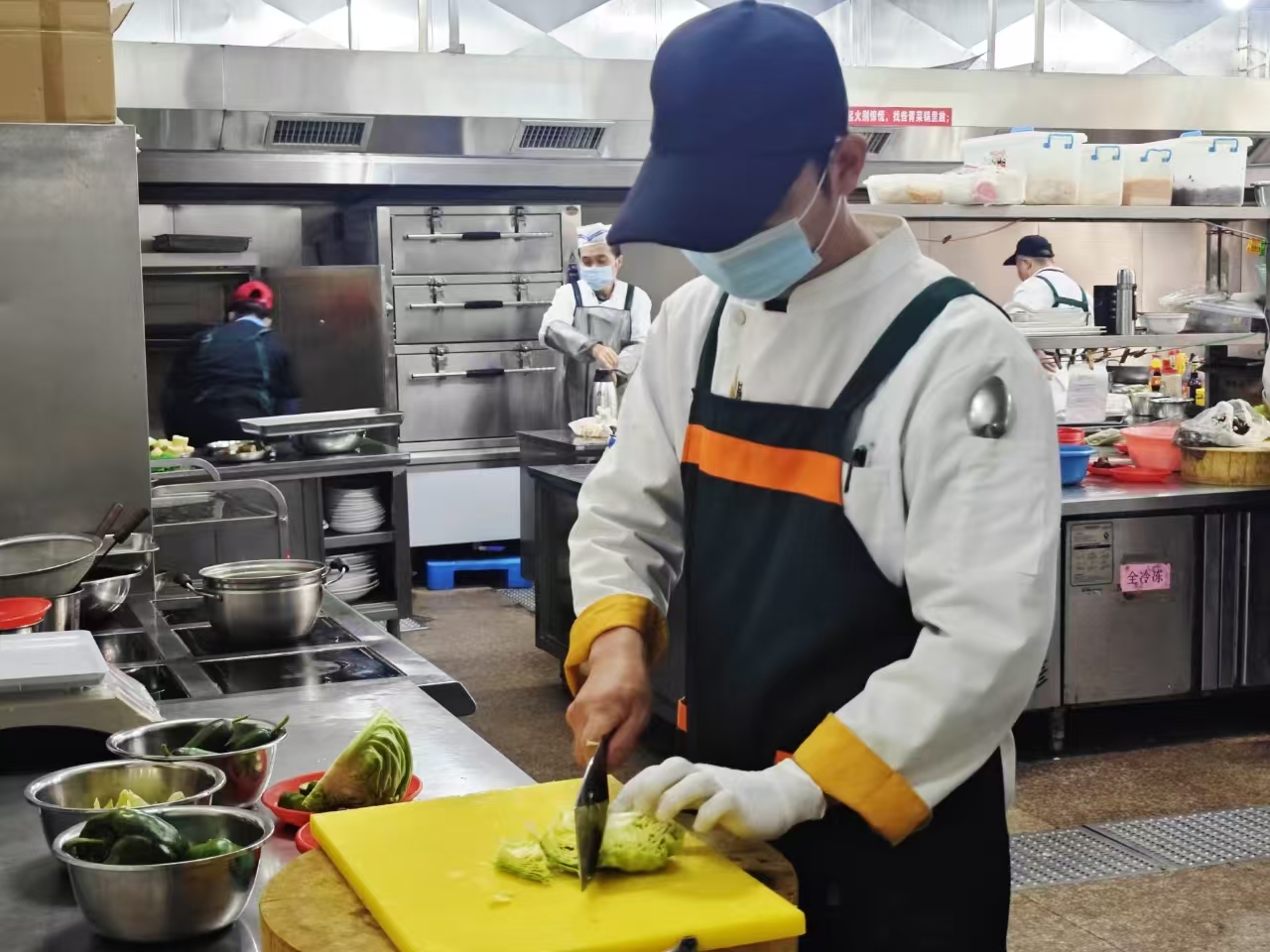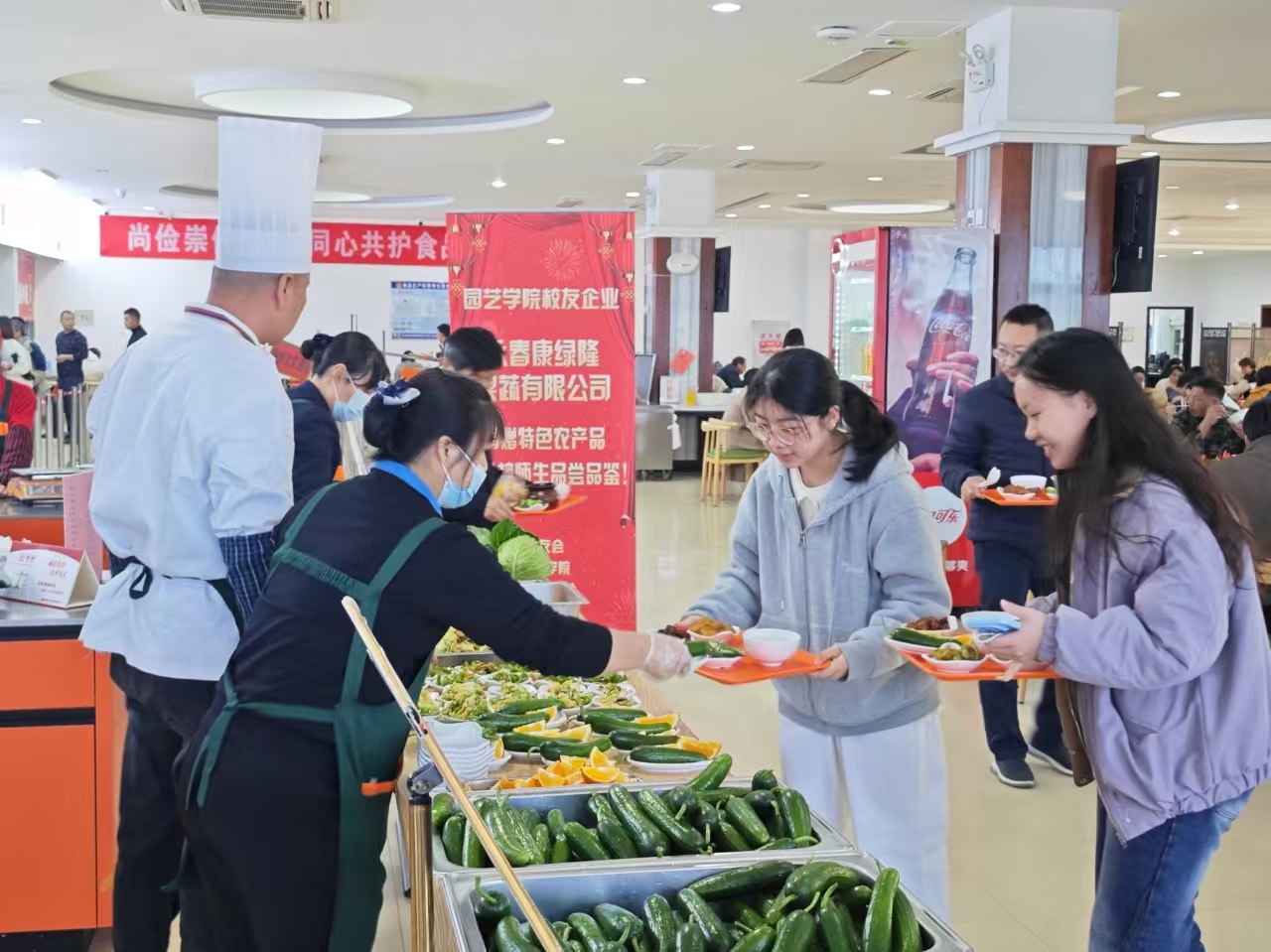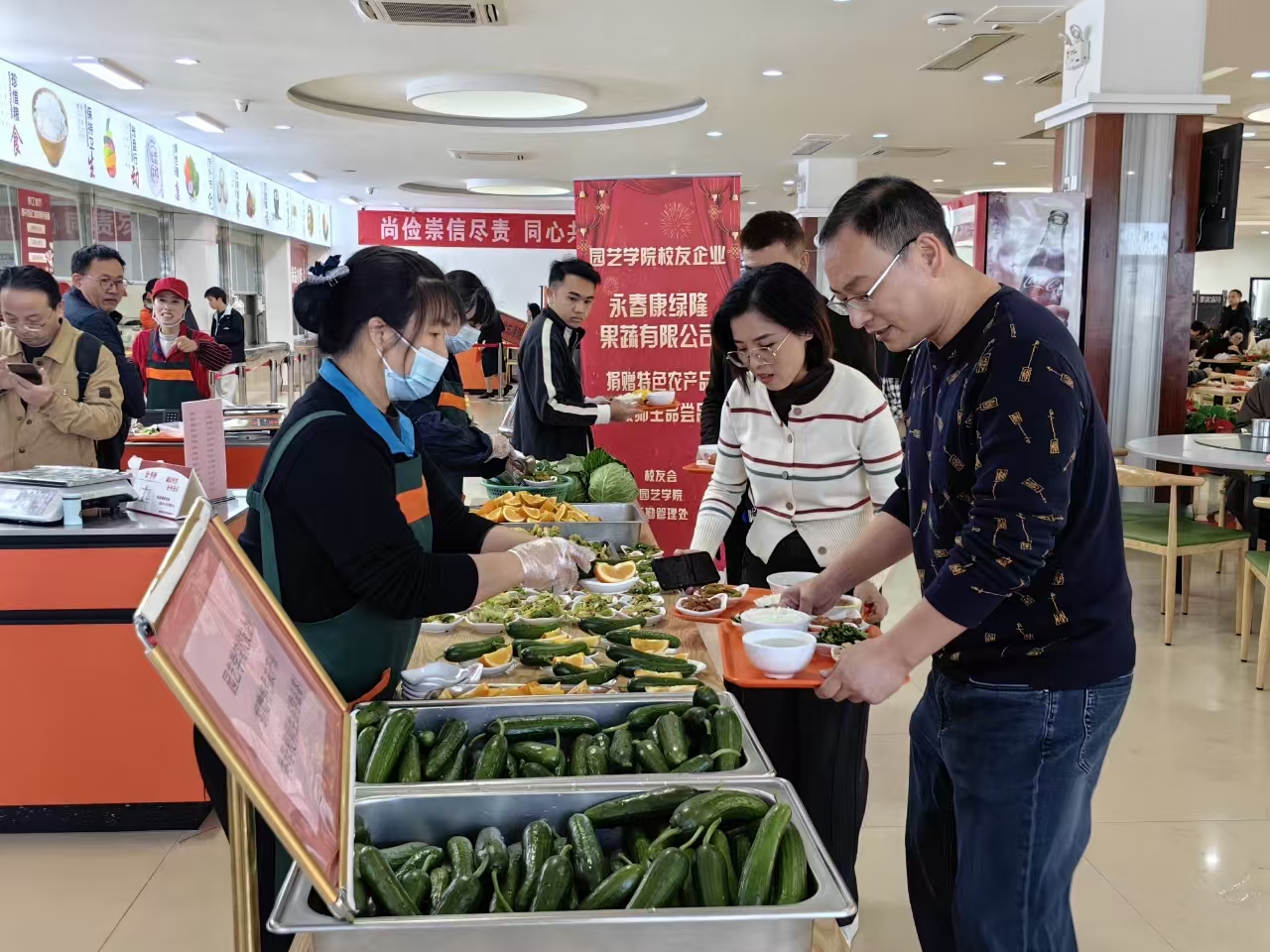 活动现场,学校教工食堂将校友企业捐赠的一批新鲜黄瓜、甘蓝、青椒、甜橙等特色农产品,精心加工制作成美食菜肴,供就餐的师生免费品尝。